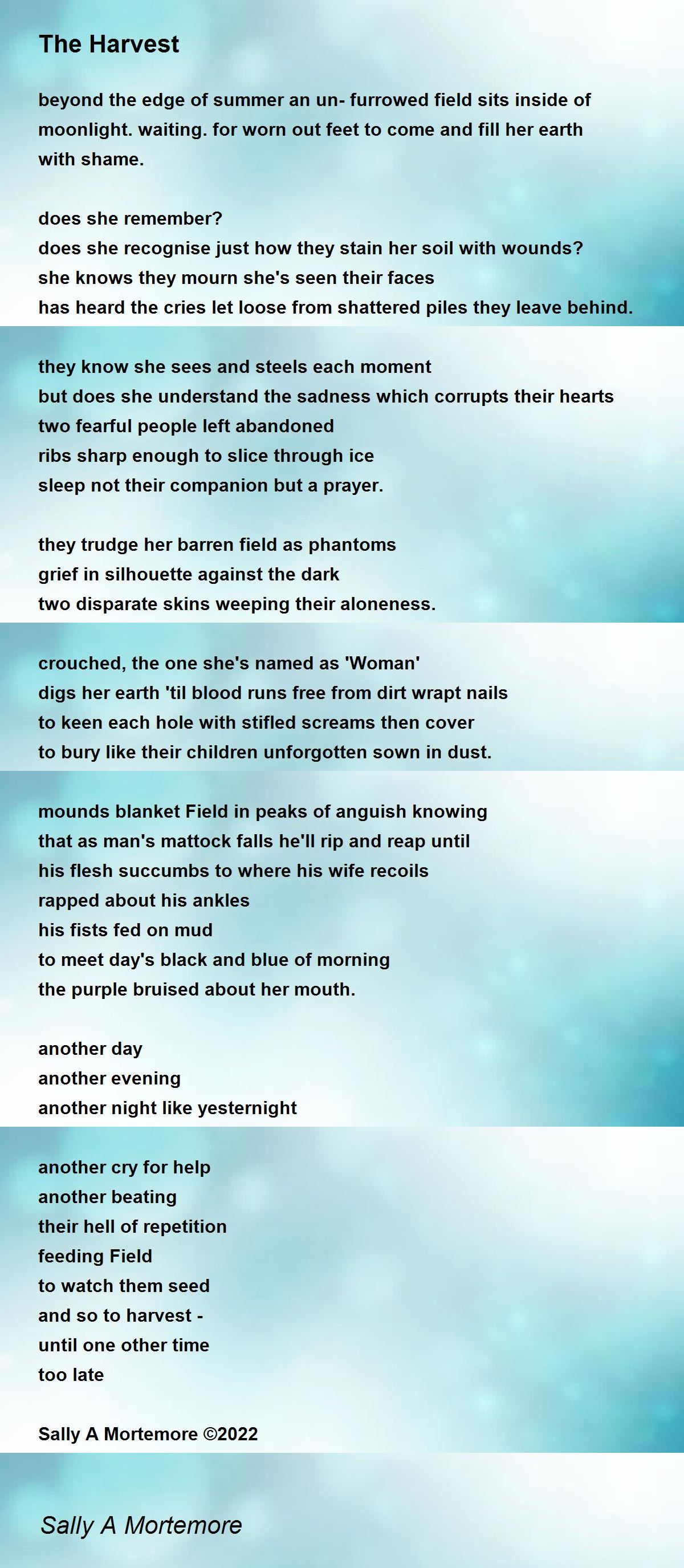 beyond the edge of summer an un-furrowed field sits inside of moonlight. waiting. for worn out feet to come and fill her earth with shame.