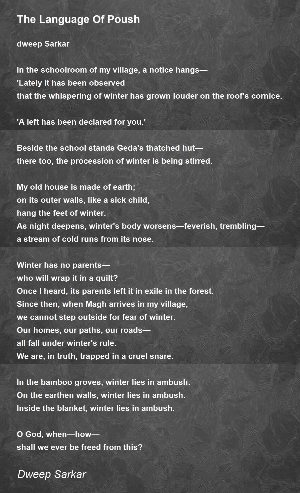 As night deepens, winter's body worsens—feverish, trembling—