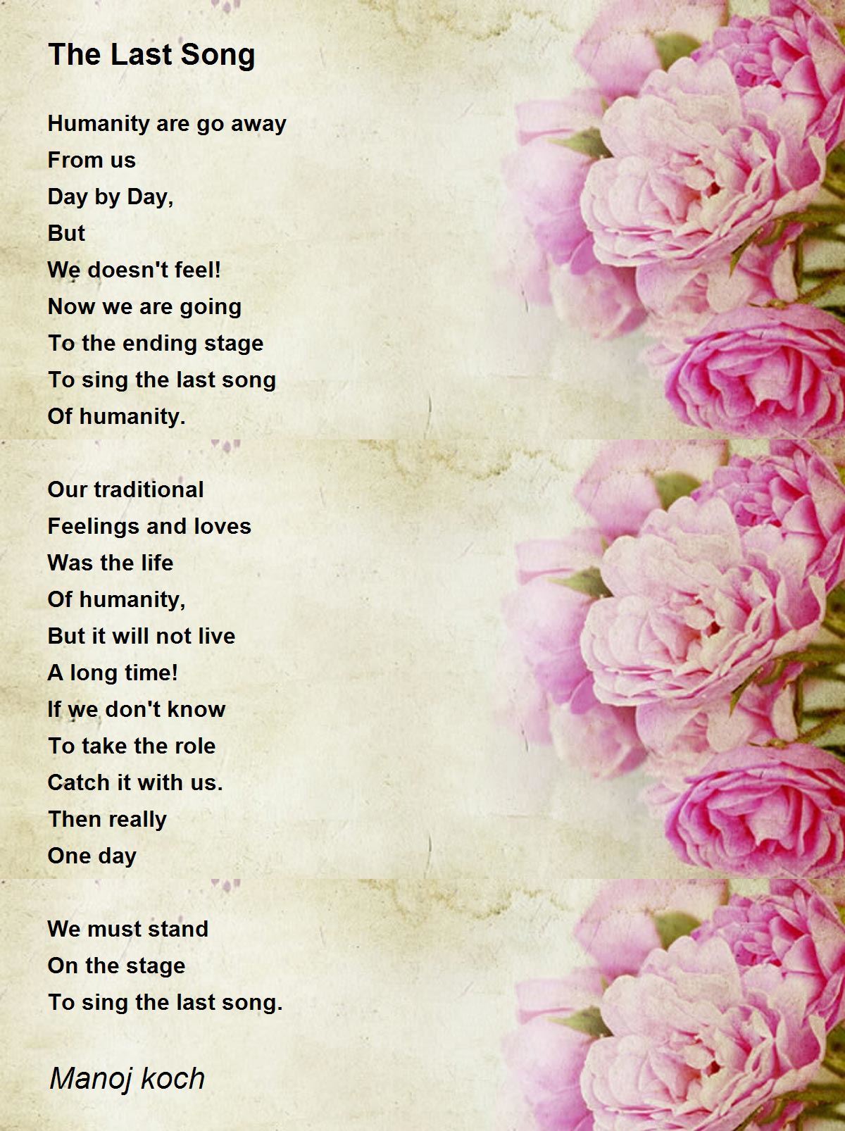 The ending stage sings the last song of humanity and such time provokes thought. We need to uplift humanity with morality and values.. May God help in establishing peace in this world...10