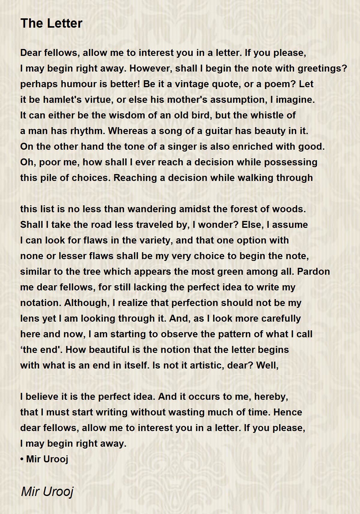 Dear fellows, allow me to interest you in a letter. If you please, I may begin right away. However, shall I begin the note with greetings? perhaps humour is better! Be it a vintage quote, or a poem? Let it be hamlet's virtue, or else his mother's assumption, I imagine. It can either be the wisdom of an old bird, but the whistle of a man has rhythm. Whereas a song of a guitar has beauty in it. On the other hand the tone of a singer is also enriched with good. Oh, poor me, how shall I ever reach a decision while possessing this pile of choices. Reaching a decision while walking through this list is no less than wandering amidst the forest of woods. Shall I take the road less traveled by, I wonder? Else, I assume I can look for flaws in the variety, and that one option with none or lesser flaws shall be my very choice to begin the note, similar to the tree which appears the most green among all. Pardon me dear fellows, for still lacking the perfect idea to write my notation. Although, I realize that perfection should not be my lens yet I am looking through it. And, as I look more carefully here and now, I am starting to observe the pattern of what I call ‘the end'. How beautiful is the notion that the letter begins with what is an end in itself. Is not it artistic, dear? Well, I believe it is the perfect idea. And it occurs to me, hereby, that I must start writing without wasting much of time. Hence dear fellows, allow me to interest you in a letter. If you please, I may begin right away.