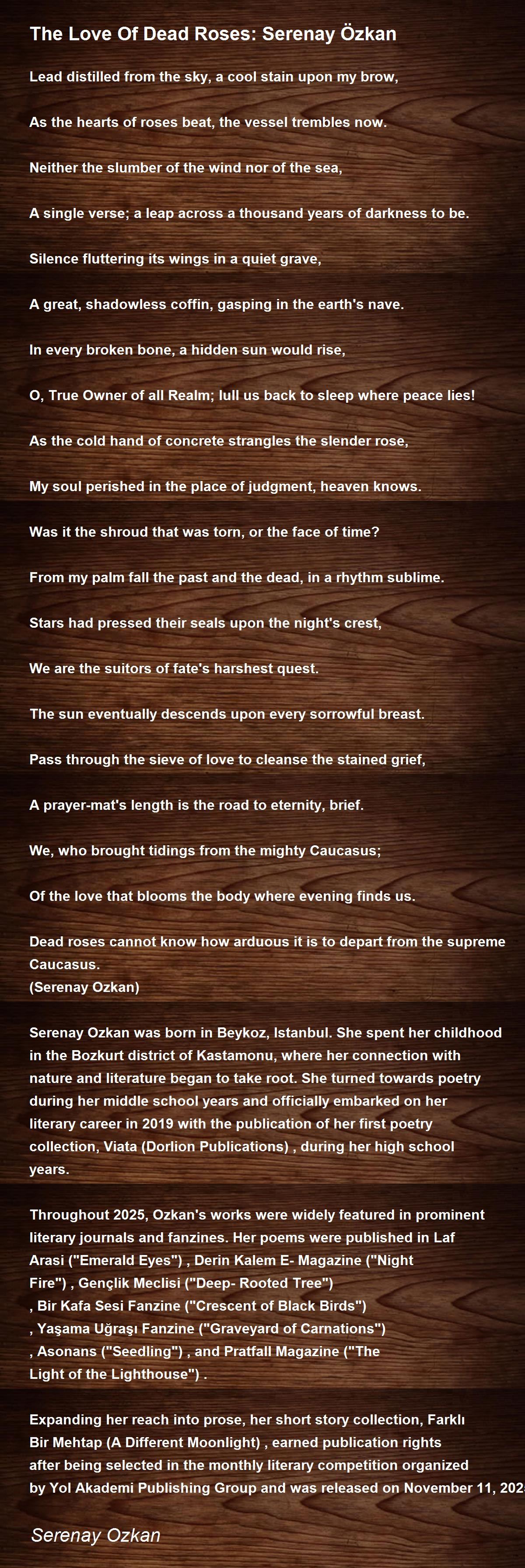 Serenay Ozkan was born in Beykoz, Istanbul. She spent her childhood in the Bozkurt district of Kastamonu, where her connection with nature and literature began to take root. She turned towards poetry during her middle school years and officially embarked on her literary career in 2019 with the publication of her first poetry collection, Viata (Dorlion Publications) , during her high school years.