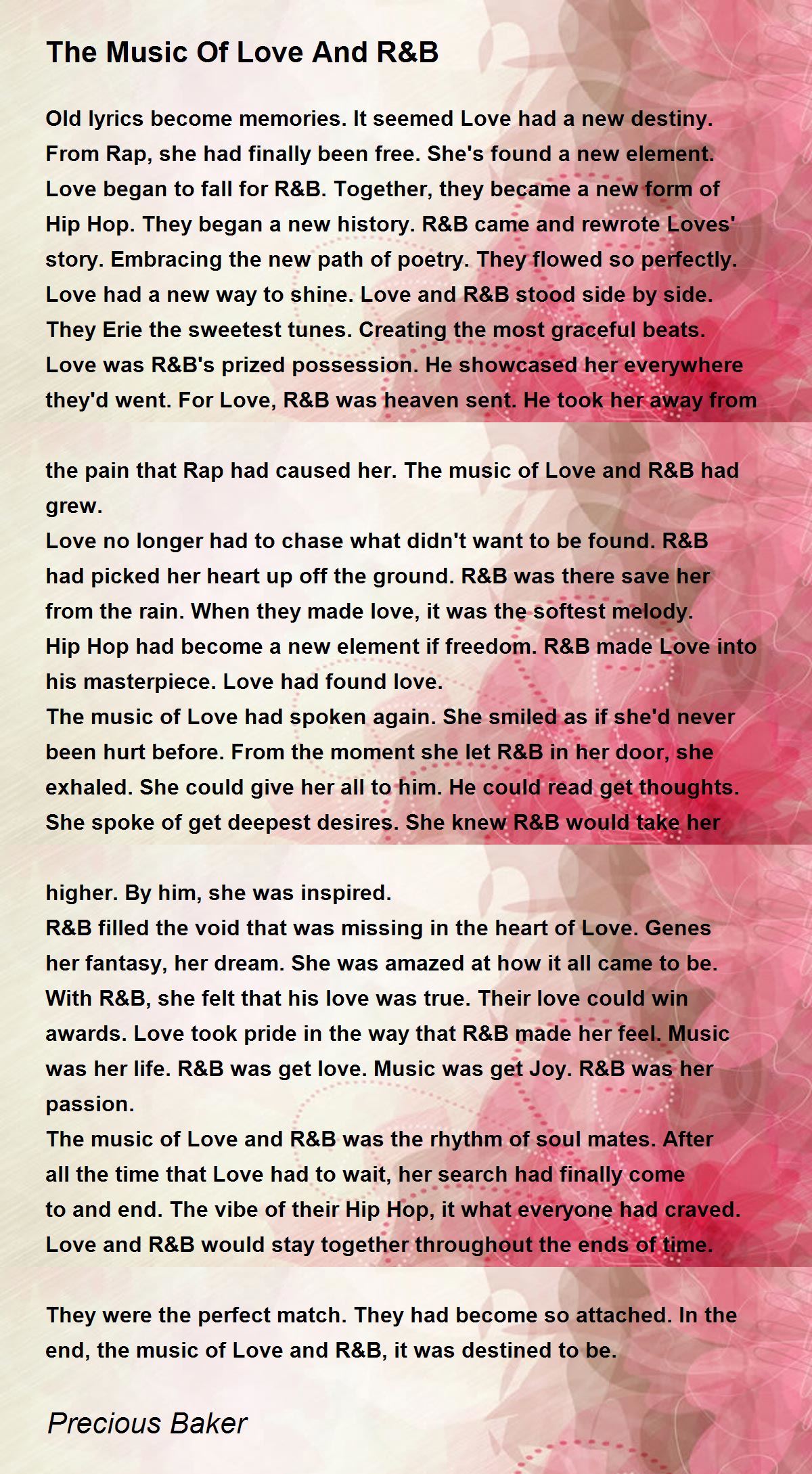 Love had a new way to shine. Love and R&B stood side by side. They Erie the sweetest tunes. Creating the most graceful beats. Love was R&B's prized possession. He showcased her everywhere they'd went. For Love, R&B was heaven sent. He took her away from the pain that Rap had caused her. The music of Love and R&B had grew.