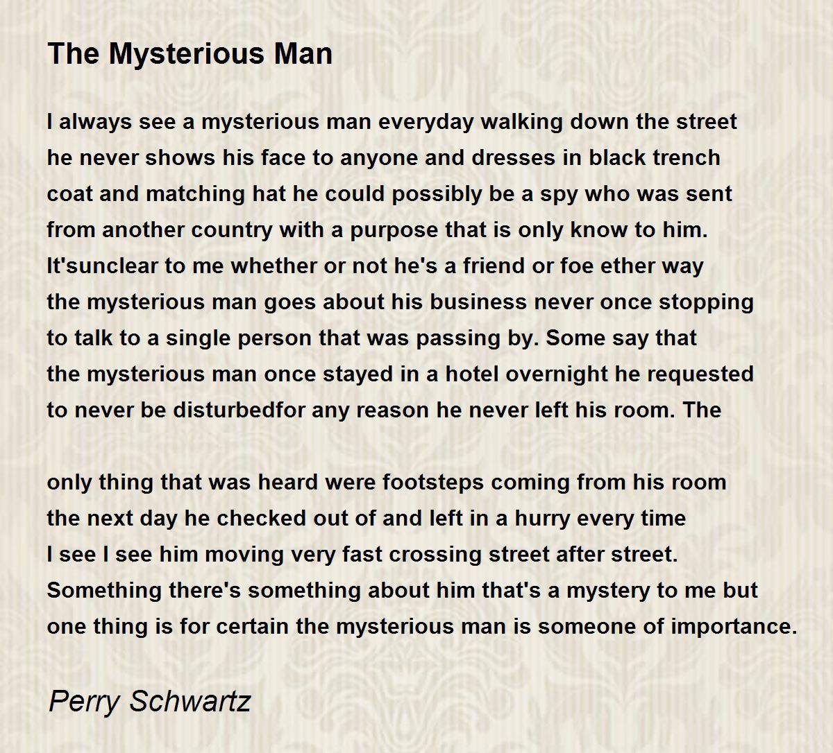 I always see a mysterious man everyday walking down the street he never shows his face to anyone and dresses in black trench coat and matching hat he could possibly be a spy who was sent from another country with a purpose that is only know to him. It'sunclear to me whether or not he's a friend or foe ether way the mysterious man goes about his business never once stopping to talk to a single person that was passing by. Some say that the mysterious man once stayed in a hotel overnight he requested to never be disturbedfor any reason he never left his room. The only thing that was heard were footsteps coming from his room the next day he checked out of and left in a hurry every time I see I see him moving very fast crossing street after street. Something there's something about him that's a mystery to me but one thing is for certain the mysterious man is someone of importance.