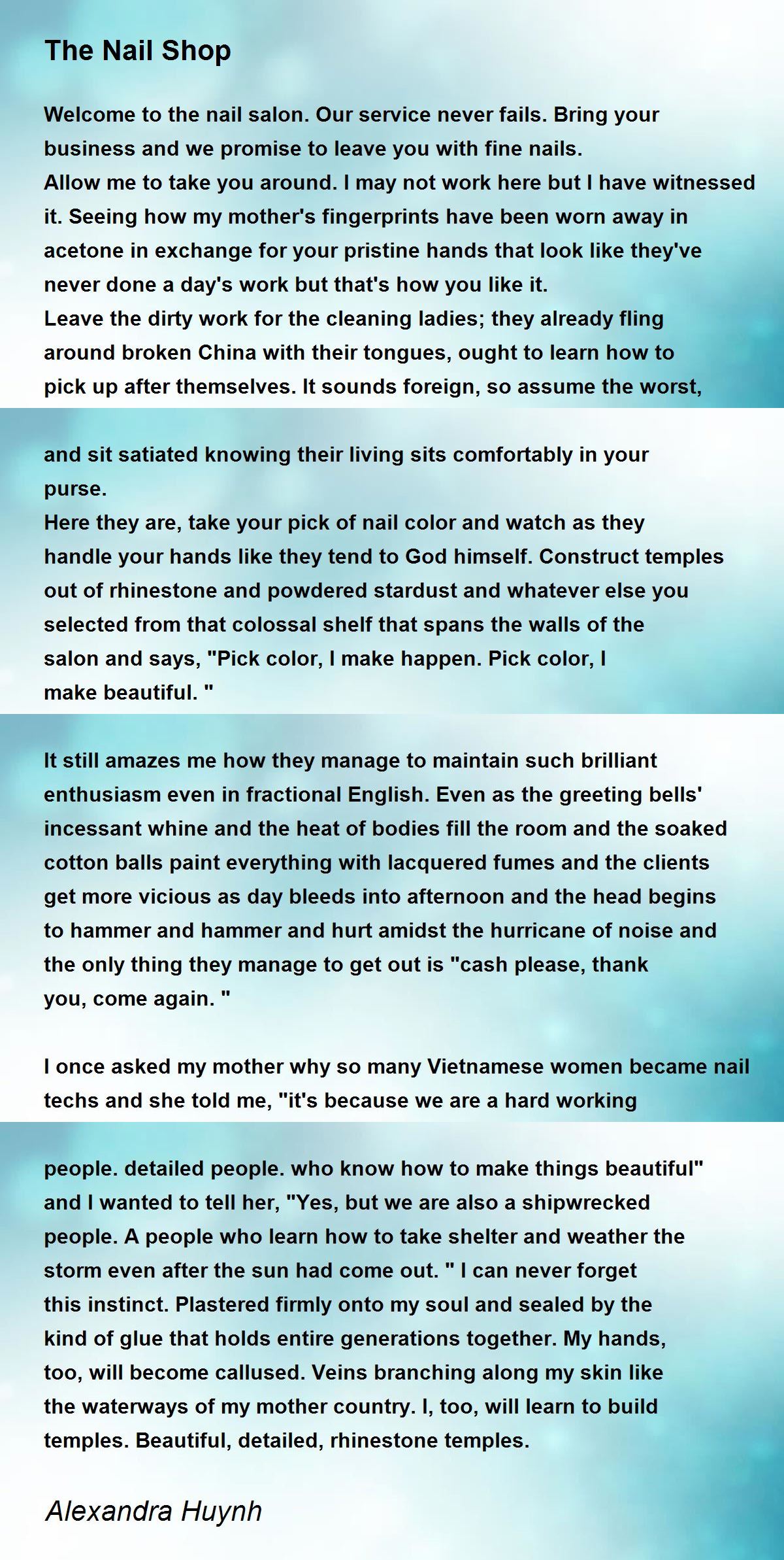 I once asked my mother why so many Vietnamese women became nail techs and she told me, "it's because we are a hard working people. detailed people. who know how to make things beautiful" and I wanted to tell her, "Yes, but we are also a shipwrecked people. A people who learn how to take shelter and weather the storm even after the sun had come out." I can never forget this instinct. Plastered firmly onto my soul and sealed by the kind of glue that holds entire generations together. My hands, too, will become callused. Veins branching along my skin like the waterways of my mother country. I, too, will learn to build temples. Beautiful, detailed, rhinestone temples.
