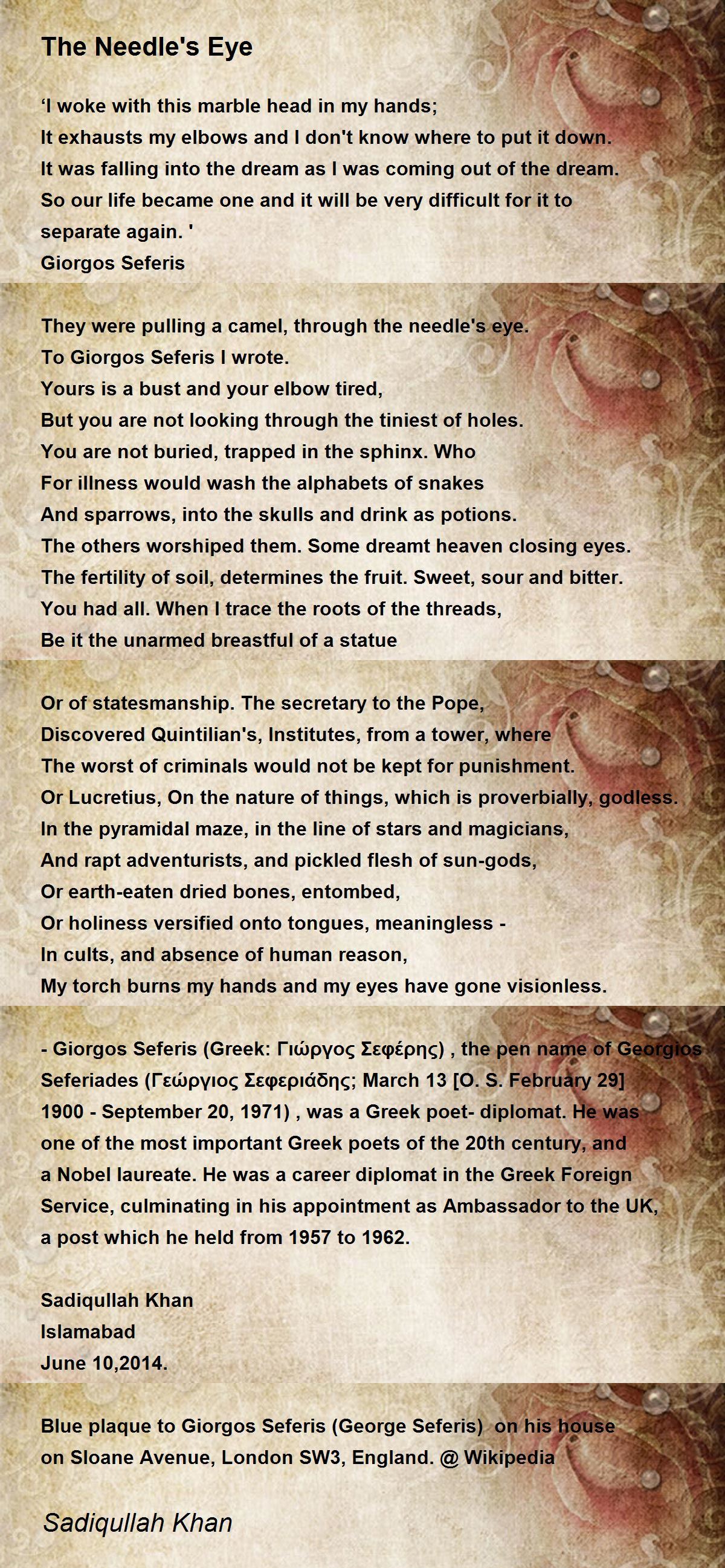 -Giorgos Seferis (Greek: Γιώργος Σεφέρης) , the pen name of Georgios Seferiades (Γεώργιος Σεφεριάδης; March 13 [O.S. February 29] 1900 - September 20,1971) , was a Greek poet-diplomat. He was one of the most important Greek poets of the 20th century, and a Nobel laureate. He was a career diplomat in the Greek Foreign Service, culminating in his appointment as Ambassador to the UK, a post which he held from 1957 to 1962.
