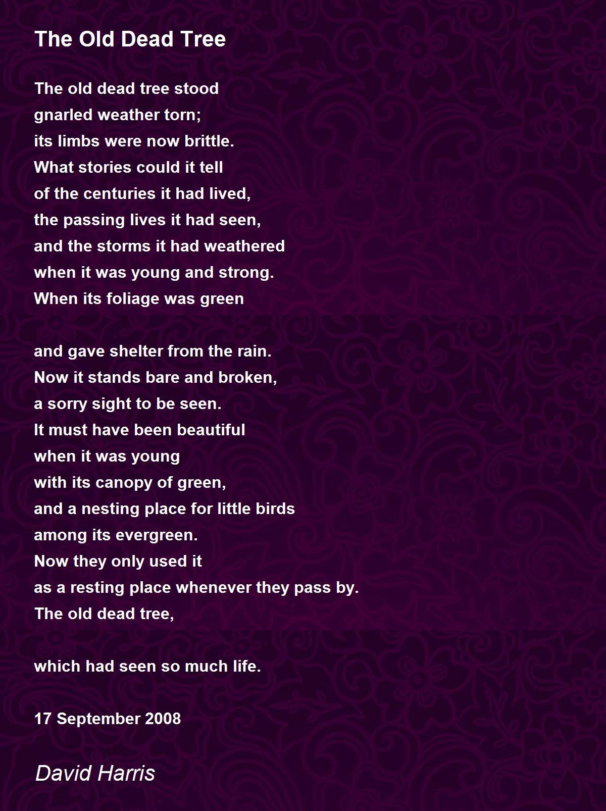 This poem captures my feelings about old dying trees, especially one I recently photographed. David I sent you a message regarding placing this beautiful poem under the photo on my website. I think I could collaborate with many your poems photographically. Beautiful writer! !