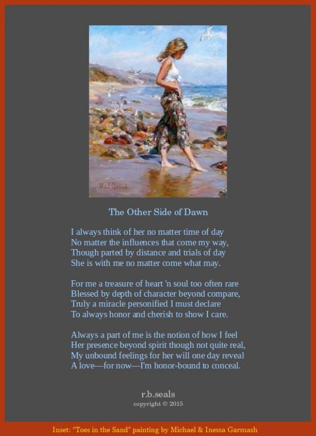 Thank you, Kim for your review of the work and your kind rating. Yes, the phrase honor-bound to conceal'' I felt would add an element of mystery at the end that readers would appreciate. Perhaps it is someoneelse's wife, or maybe it's the writer who is married. Maybe both are married and thus, the mystery remains unsolved. Best wishes, Kim!