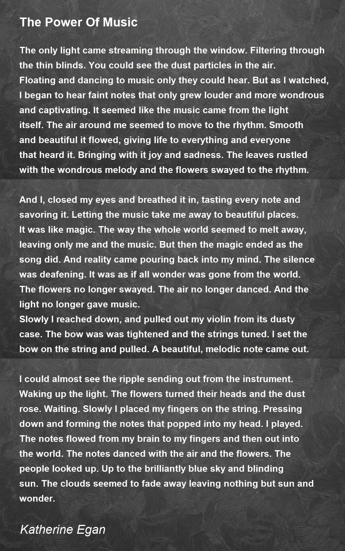 The only light came streaming through the window. Filtering through the thin blinds. You could see the dust particles in the air. Floating and dancing to music only they could hear. But as I watched, I began to hear faint notes that only grew louder and more wondrous and captivating. It seemed like the music came from the light itself. The air around me seemed to move to the rhythm. Smooth and beautiful it flowed, giving life to everything and everyone that heard it. Bringing with it joy and sadness. The leaves rustled with the wondrous melody and the flowers swayed to the rhythm. And I, closed my eyes and breathed it in, tasting every note and savoring it. Letting the music take me away to beautiful places. It was like magic. The way the whole world seemed to melt away, leaving only me and the music. But then the magic ended as the song did. And reality came pouring back into my mind. The silence was deafening. It was as if all wonder was gone from the world. The flowers no longer swayed. The air no longer danced. And the light no longer gave music.