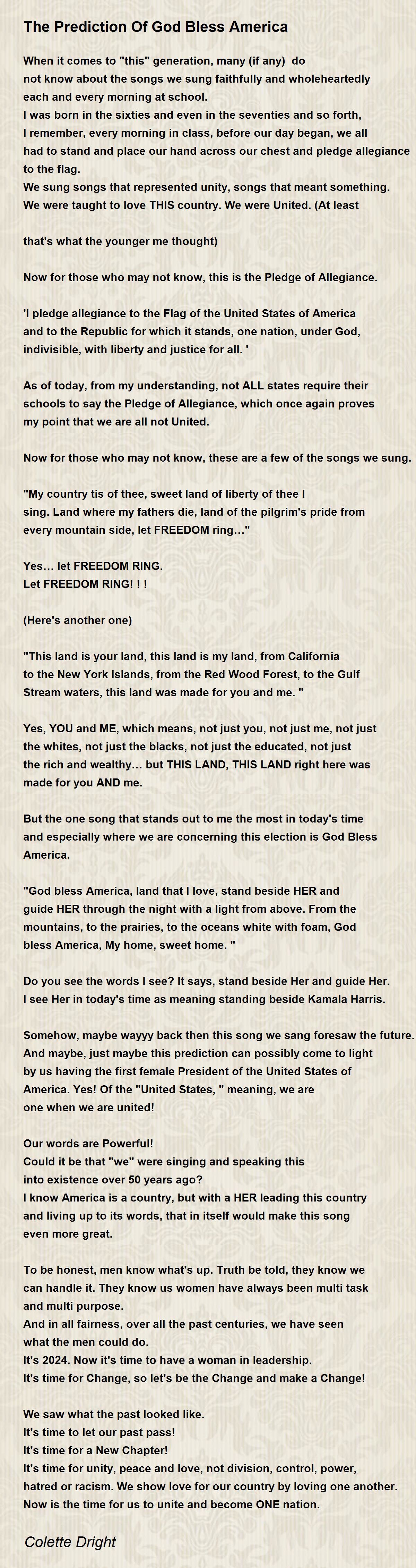 "God bless America, land that I love, stand beside HER and guide HER through the night with a light from above. From the mountains, to the prairies, to the oceans white with foam, God bless America, My home, sweet home."