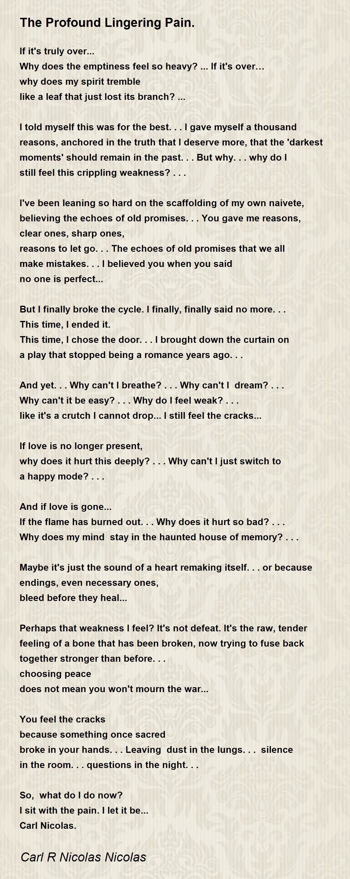 I told myself this was for the best... I gave myself a thousand reasons, anchored in the truth that I deserve more, that the 'darkest moments' should remain in the past... But why... why do I still feel this crippling weakness? ...