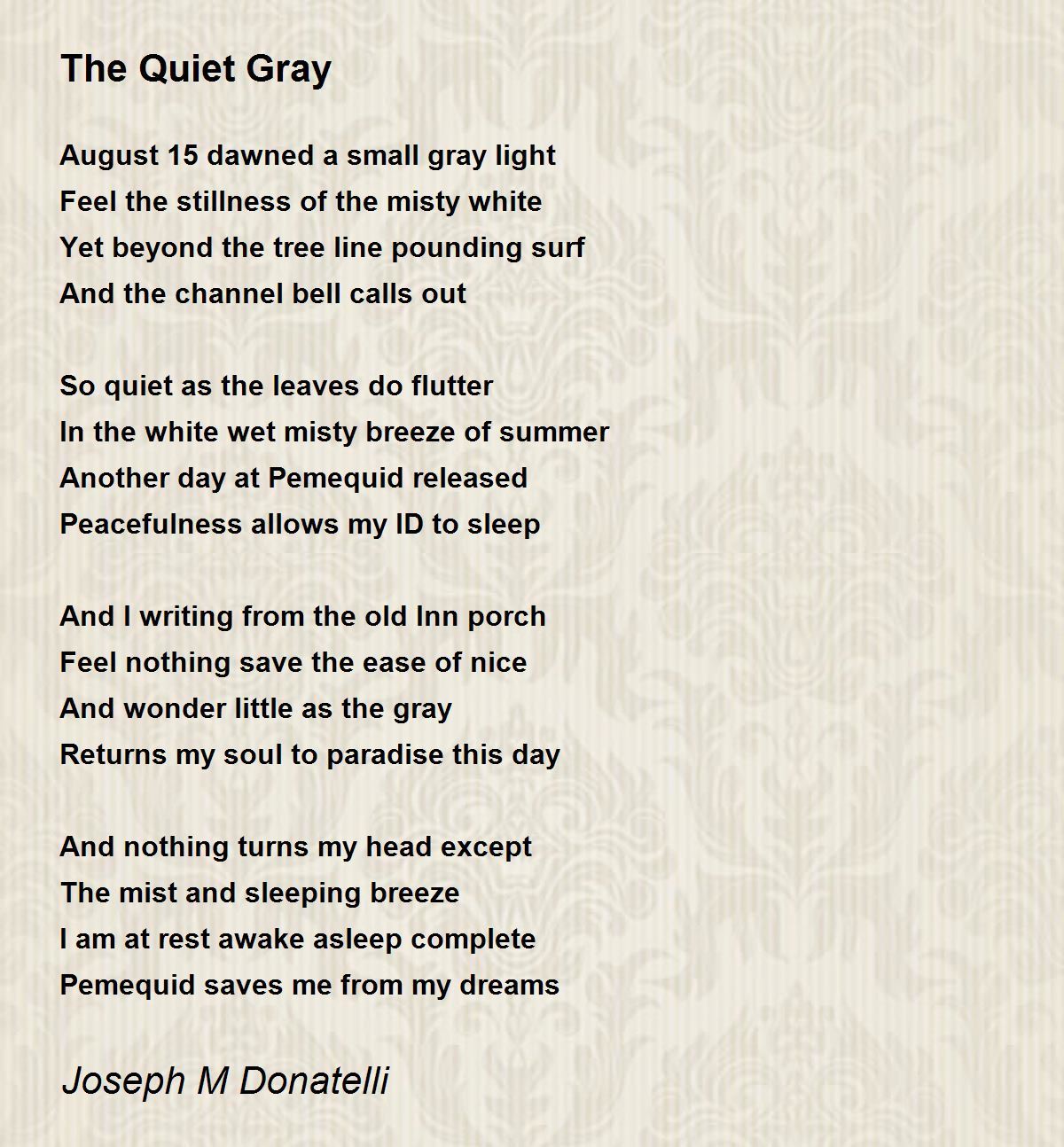 The quiet gray Feel nothing save the ease of nice - love those word combinations and the images they evoke. Well done on this poem.