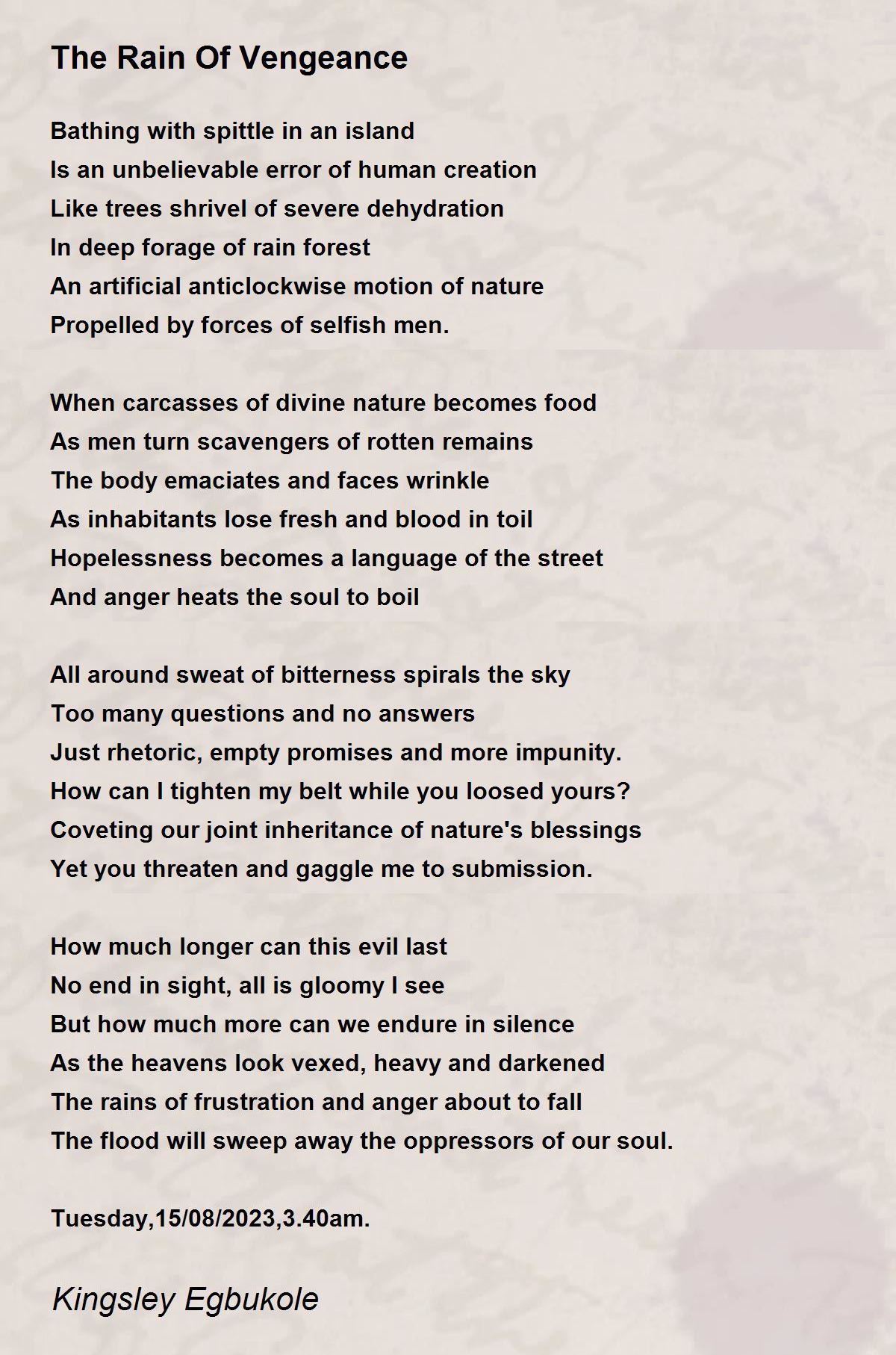 The flood will sweep away the oppressors of our soul.