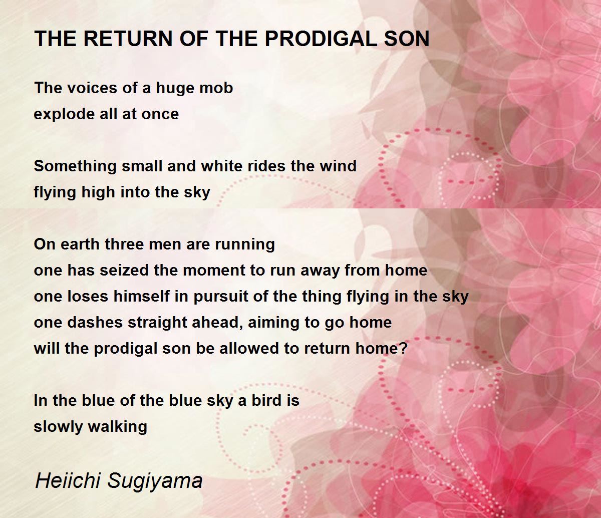 ''As well as referring to the biblical parable, this poem is a visual depiction of a baseball game: with the bases full, the batter has just hit the ball high in the sky, and runners are making a dash for home base.'' (from 'Poetry International')