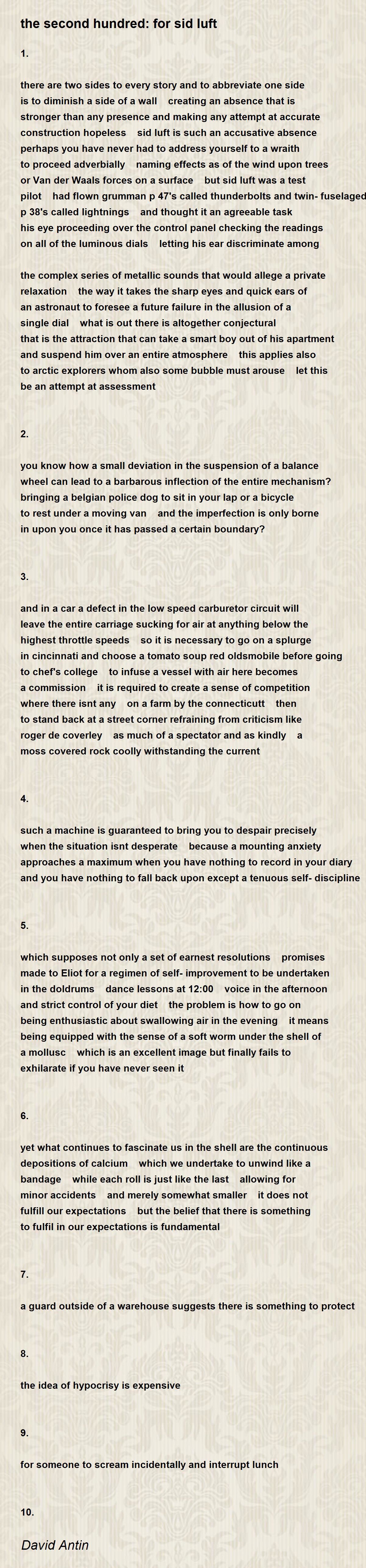 there are two sides to every story and to abbreviate one side is to diminish a side of a wall creating an absence that is stronger than any presence and making any attempt at accurate construction hopeless sid luft is such an accusative absence perhaps you have never had to address yourself to a wraith to proceed adverbially naming effects as of the wind upon trees or Van der Waals forces on a surface but sid luft was a test pilot had flown grumman p 47's called thunderbolts and twin-fuselaged p 38's called lightnings and thought it an agreeable task his eye proceeding over the control panel checking the readings on all of the luminous dials letting his ear discriminate among the complex series of metallic sounds that would allege a private relaxation the way it takes the sharp eyes and quick ears of an astronaut to foresee a future failure in the allusion of a single dial what is out there is altogether conjectural that is the attraction that can take a smart boy out of his apartment and suspend him over an entire atmosphere this applies also to arctic explorers whom also some bubble must arouse let this be an attempt at assessment