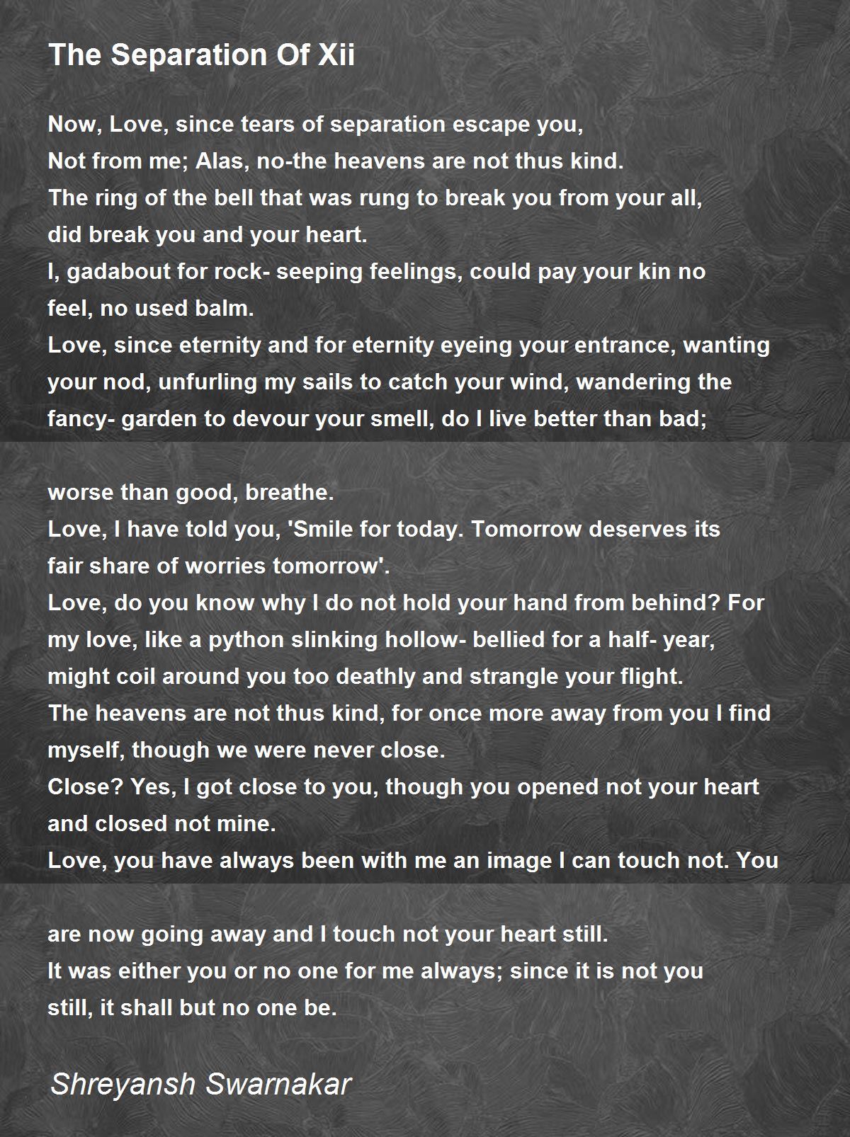 The heavens are not thus kind, for once more away from you I find myself, though we were never close.