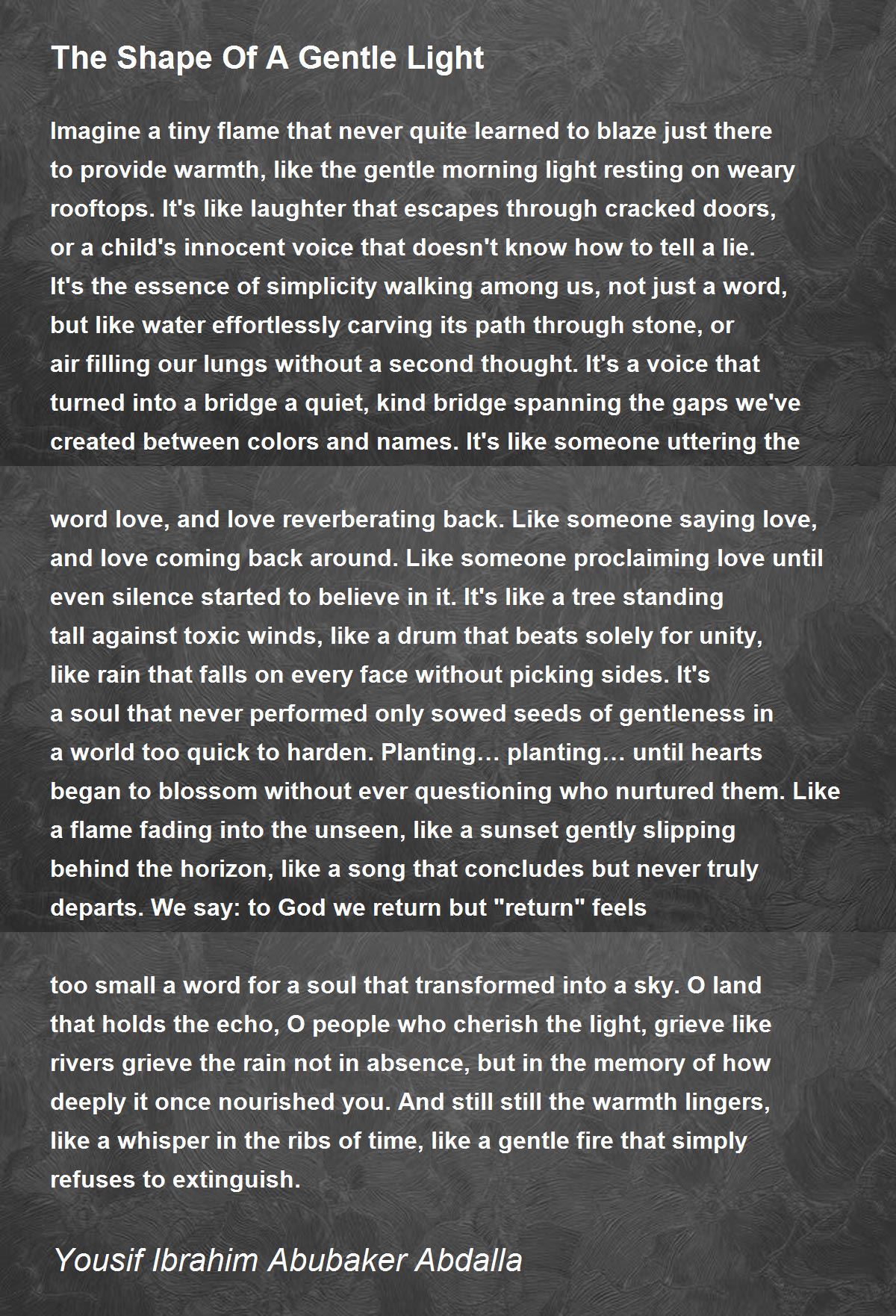 Imagine a tiny flame that never quite learned to blaze just there to provide warmth, like the gentle morning light resting on weary rooftops. It's like laughter that escapes through cracked doors, or a child's innocent voice that doesn't know how to tell a lie. It's the essence of simplicity walking among us, not just a word, but like water effortlessly carving its path through stone, or air filling our lungs without a second thought. It's a voice that turned into a bridge a quiet, kind bridge spanning the gaps we've created between colors and names. It's like someone uttering the word love, and love reverberating back. Like someone saying love, and love coming back around. Like someone proclaiming love until even silence started to believe in it. It's like a tree standing tall against toxic winds, like a drum that beats solely for unity, like rain that falls on every face without picking sides. It's a soul that never performed only sowed seeds of gentleness in a world too quick to harden. Planting… planting… until hearts began to blossom without ever questioning who nurtured them. Like a flame fading into the unseen, like a sunset gently slipping behind the horizon, like a song that concludes but never truly departs. We say: to God we return but "return" feels too small a word for a soul that transformed into a sky. O land that holds the echo, O people who cherish the light, grieve like rivers grieve the rain not in absence, but in the memory of how deeply it once nourished you. And still still the warmth lingers, like a whisper in the ribs of time, like a gentle fire that simply refuses to extinguish.