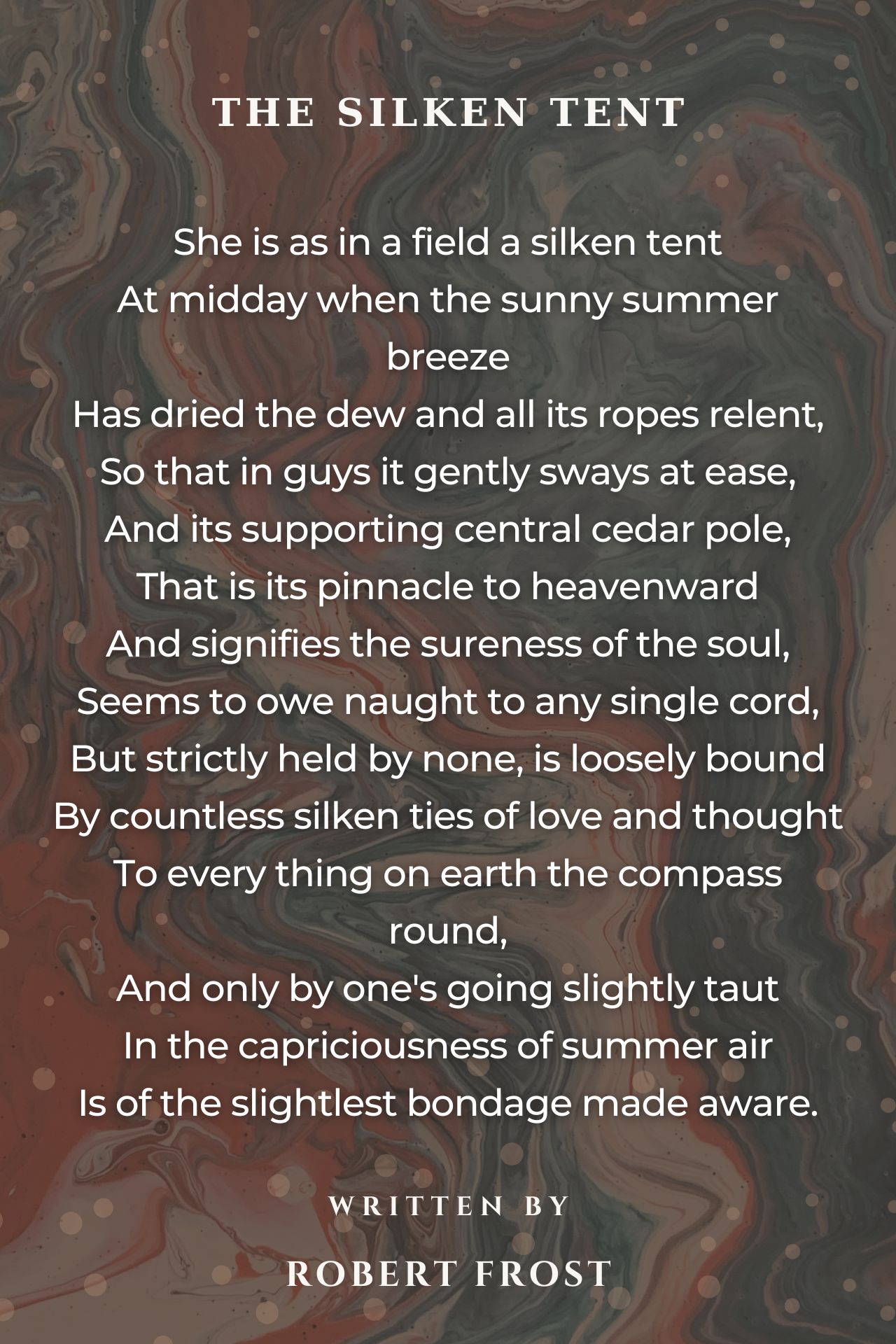 Discussed this poem in an English A-Level class last year and it was utterly condemned. In a world blessed with the existence of sunsets and mountain ranges, Frost chooses to express the sentiments of a woman through the metaphor of a tent. Wonderful...