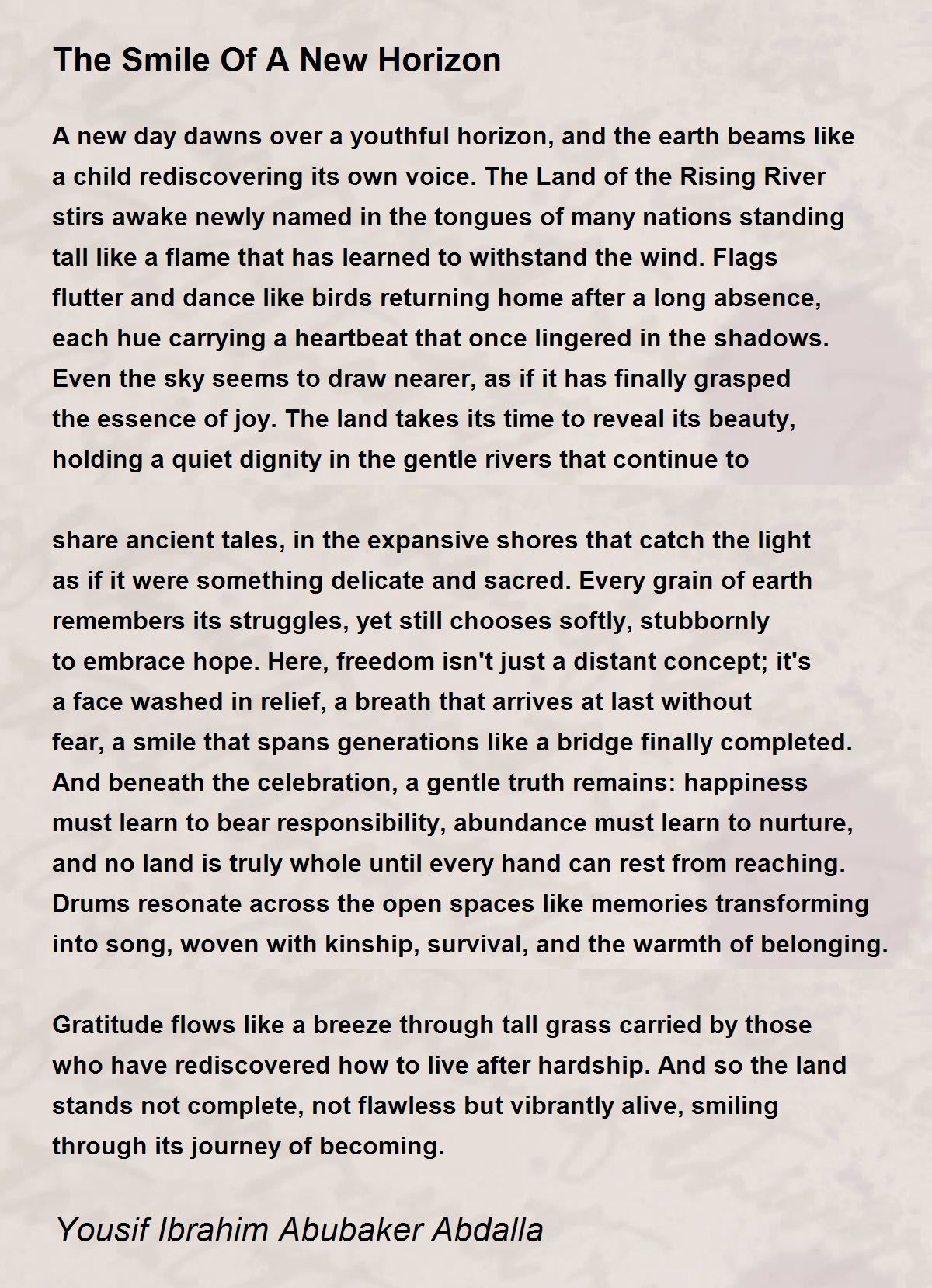 A new day dawns over a youthful horizon, and the earth beams like a child rediscovering its own voice. The Land of the Rising River stirs awake newly named in the tongues of many nations standing tall like a flame that has learned to withstand the wind. Flags flutter and dance like birds returning home after a long absence, each hue carrying a heartbeat that once lingered in the shadows. Even the sky seems to draw nearer, as if it has finally grasped the essence of joy. The land takes its time to reveal its beauty, holding a quiet dignity in the gentle rivers that continue to share ancient tales, in the expansive shores that catch the light as if it were something delicate and sacred. Every grain of earth remembers its struggles, yet still chooses softly, stubbornly to embrace hope. Here, freedom isn't just a distant concept; it's a face washed in relief, a breath that arrives at last without fear, a smile that spans generations like a bridge finally completed. And beneath the celebration, a gentle truth remains: happiness must learn to bear responsibility, abundance must learn to nurture, and no land is truly whole until every hand can rest from reaching. Drums resonate across the open spaces like memories transforming into song, woven with kinship, survival, and the warmth of belonging. Gratitude flows like a breeze through tall grass carried by those who have rediscovered how to live after hardship. And so the land stands not complete, not flawless but vibrantly alive, smiling through its journey of becoming.