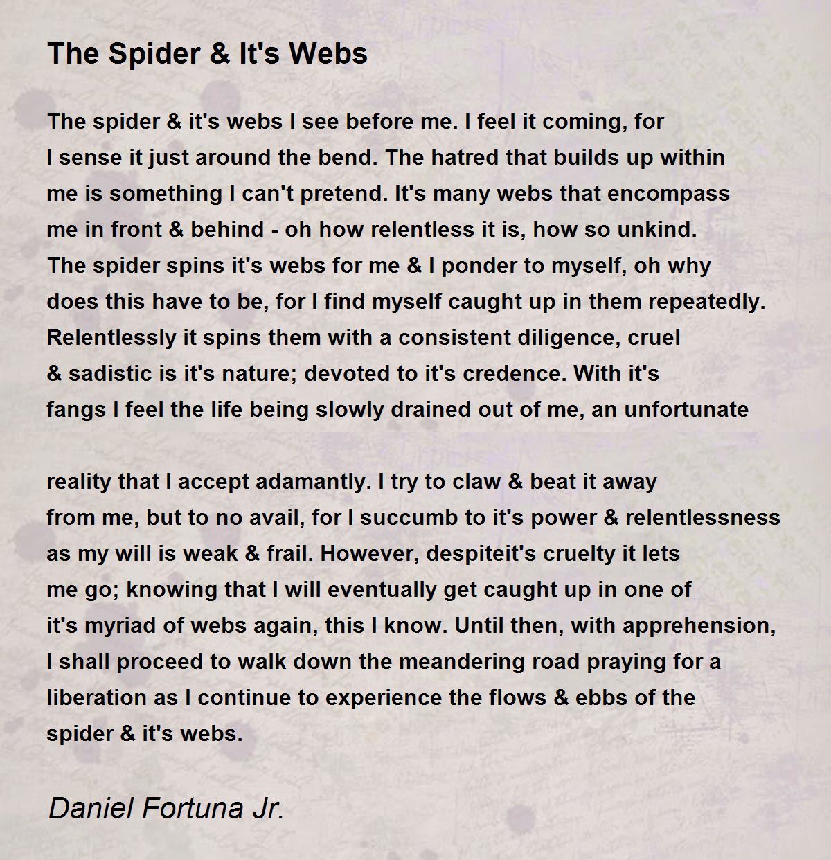 The spider & it's webs I see before me.I feel it coming, for I sense it just around the bend.The hatred that builds up within me is something I can't pretend.It's many webs that encompass me in front & behind - oh how relentless it is, how so unkind. The spider spins it's webs for me & I ponder to myself, oh why does this have to be, for I find myself caught up in them repeatedly. Relentlessly it spins them with a consistent diligence, cruel & sadistic is it's nature; devoted to it's credence.With it's fangs I feel the life being slowly drained out of me, an unfortunate reality that I accept adamantly.I try to claw & beat it away from me, but to no avail, for I succumb to it's power & relentlessness as my will is weak & frail.However, despiteit's cruelty it lets me go; knowing that I will eventually get caught up in one of it's myriad of webs again, this I know.Until then, with apprehension, I shall proceed to walk down the meandering road praying for a liberation as I continue to experience the flows & ebbs of the spider & it's webs.