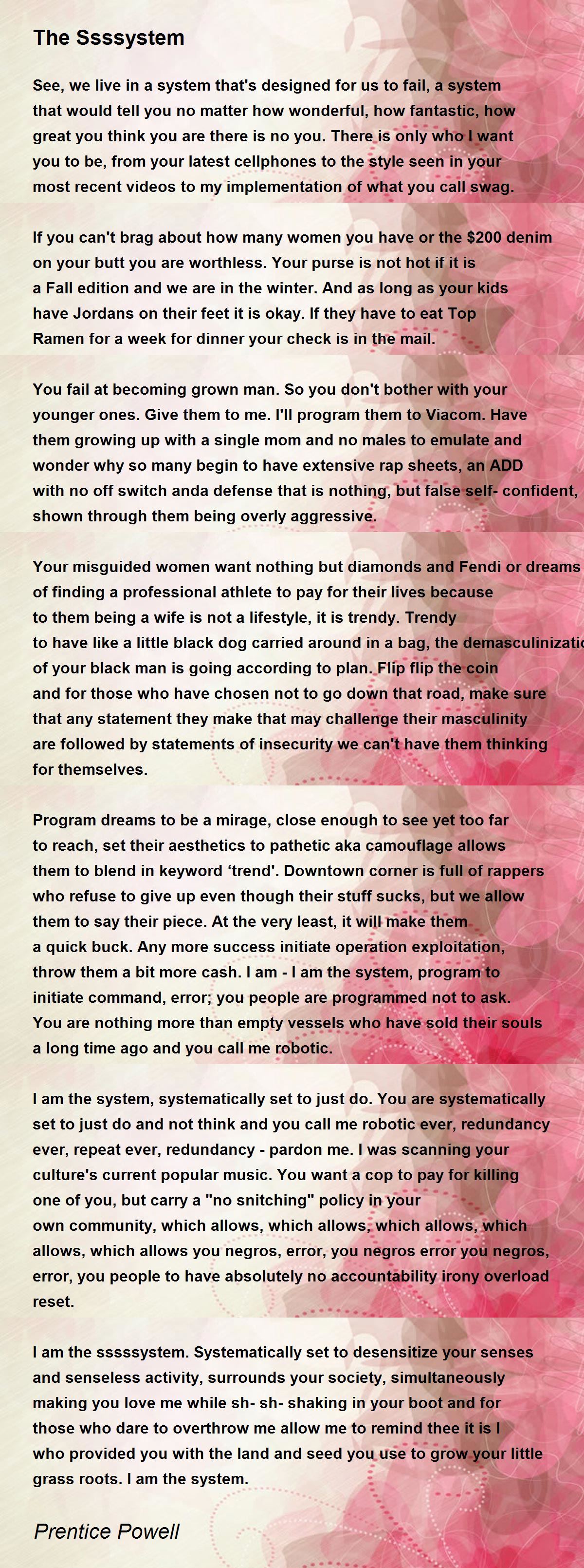 I am the sssssystem. Systematically set to desensitize your senses and senseless activity, surrounds your society, simultaneously making you love me while sh-sh-shaking in your boot and for those who dare to overthrow me allow me to remind thee it is I who provided you with the land and seed you use to grow your little grass roots. I am the system.