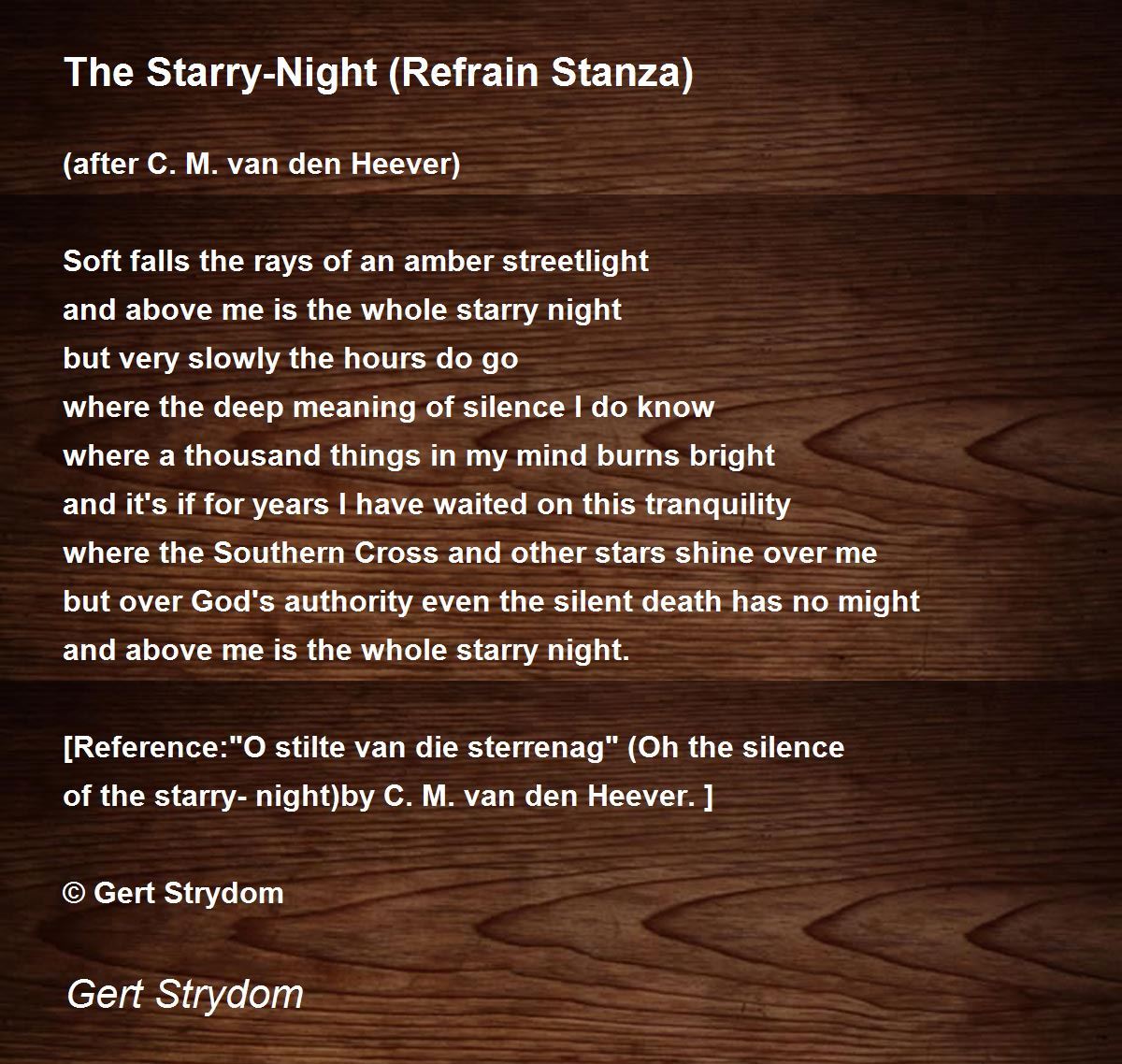 [Reference:"O stilte van die sterrenag" (Oh the silence of the starry-night)by C. M. van den Heever.]