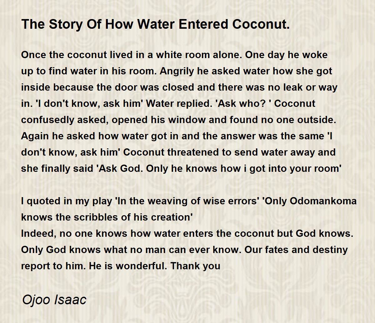 Once the coconut lived in a white room alone. One day he woke up to find water in his room. Angrily he asked water how she got inside because the door was closed and there was no leak or way in. 'I don't know, ask him' Water replied. 'Ask who? ' Coconut confusedly asked, opened his window and found no one outside. Again he asked how water got in and the answer was the same 'I don't know, ask him' Coconut threatened to send water away and she finally said 'Ask God. Only he knows how i got into your room'