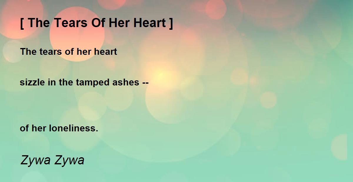 The tears of her heart sizzle in the tamped ashes -- of her loneliness.