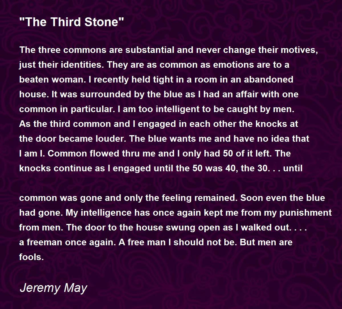 The three commons are substantial and never change their motives, just their identities. They are as common as emotions are to a beaten woman. I recently held tight in a room in an abandoned house. It was surrounded by the blue as I had an affair with one common in particular. I am too intelligent to be caught by men. As the third common and I engaged in each other the knocks at the door became louder. The blue wants me and have no idea that I am I. Common flowed thru me and I only had 50 of it left. The knocks continue as I engaged until the 50 was 40, the 30...until common was gone and only the feeling remained. Soon even the blue had gone. My intelligence has once again kept me from my punishment from men. The door to the house swung open as I walked out.... a freeman once again. A free man I should not be. But men are fools.
