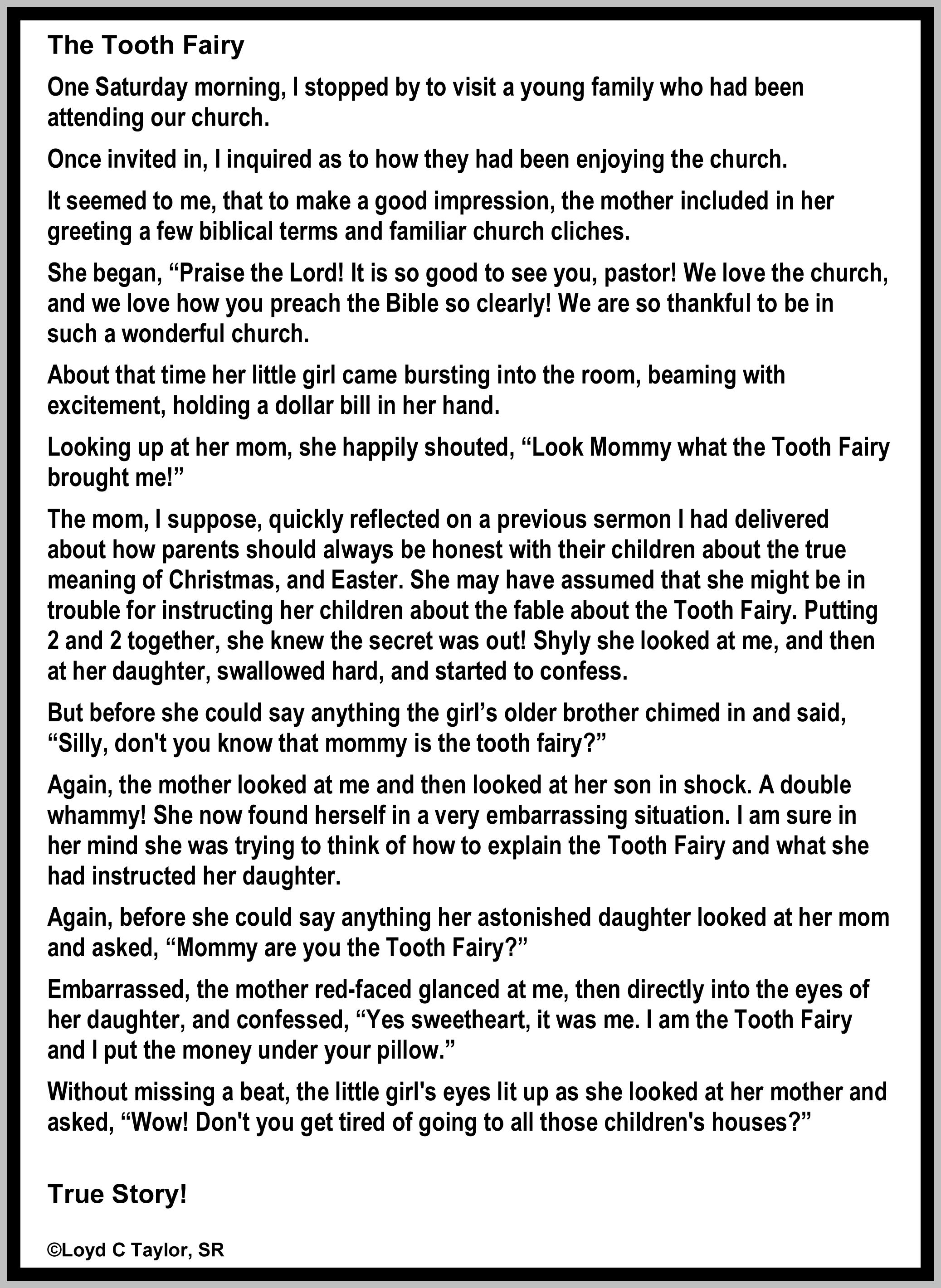 The mom, I suppose, quickly reflected on a previous sermon I had delivered about how parents should always be honest with their children about the true meaning of Christmas, and Easter. She may have assumed that she might be in trouble for instructing her children about the fable about the Tooth Fairy. Putting 2 and 2 together, she knew the secret was out! Shyly she looked at me, and then at her daughter, swallowed hard, and started to confess.