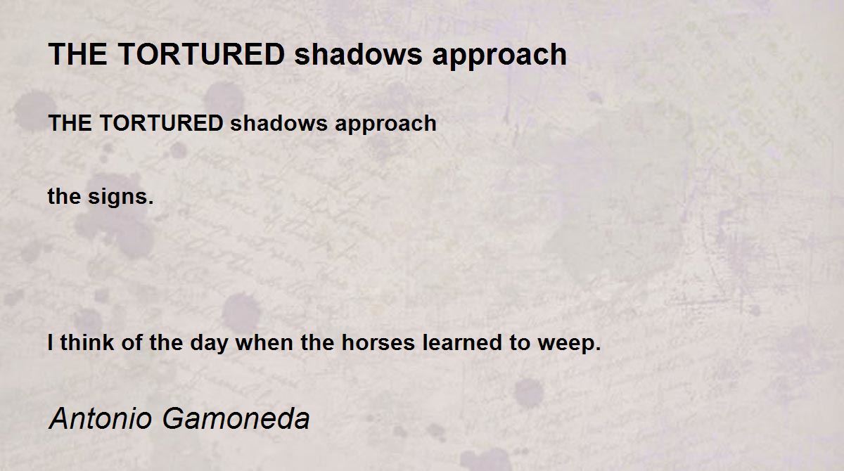 THE TORTURED shadows approach the signs. I think of the day when the horses learned to weep.