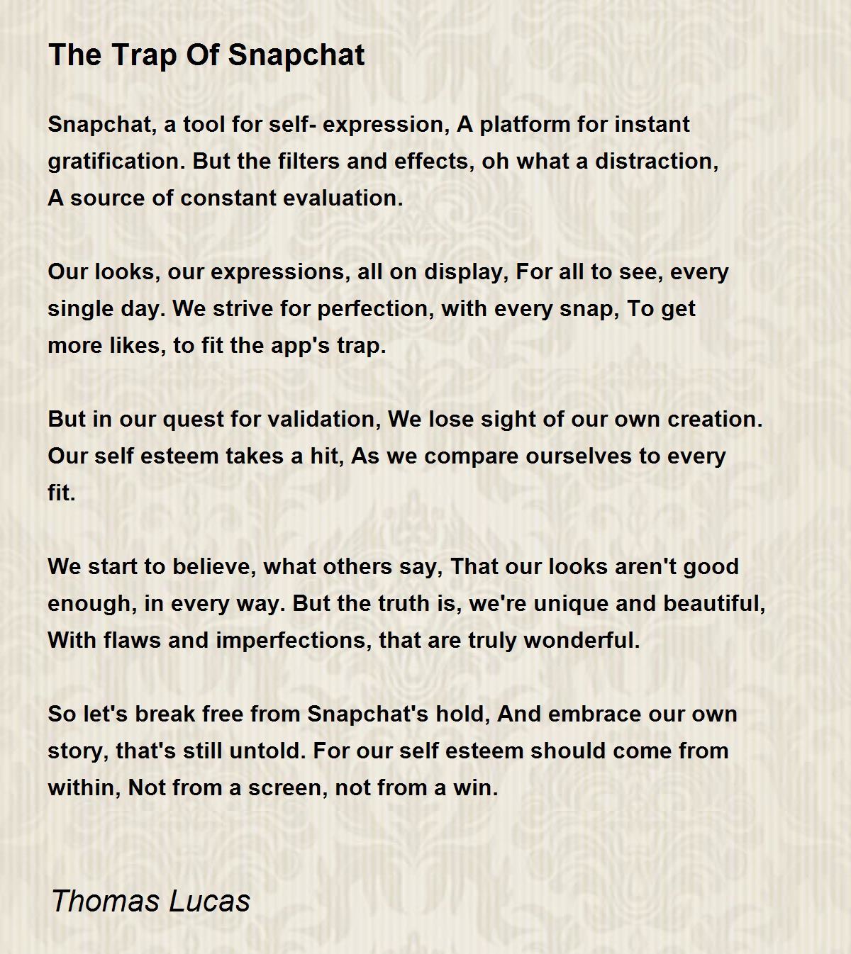 So let's break free from Snapchat's hold, And embrace our own story, that's still untold. For our self esteem should come from within, Not from a screen, not from a win.