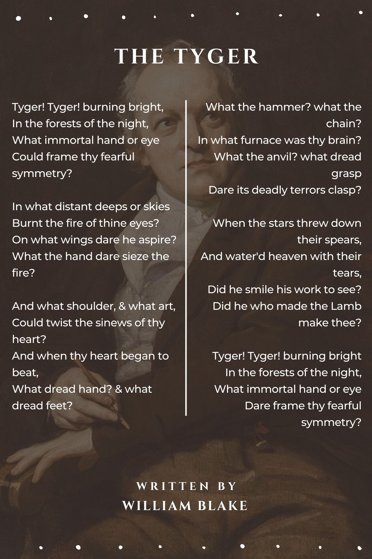 Tyger! Tyger! burning bright In the forests of the night, What immortal hand or eye Dare frame thy fearful symmetry? .... brilliant concluding. Beautiful poem.