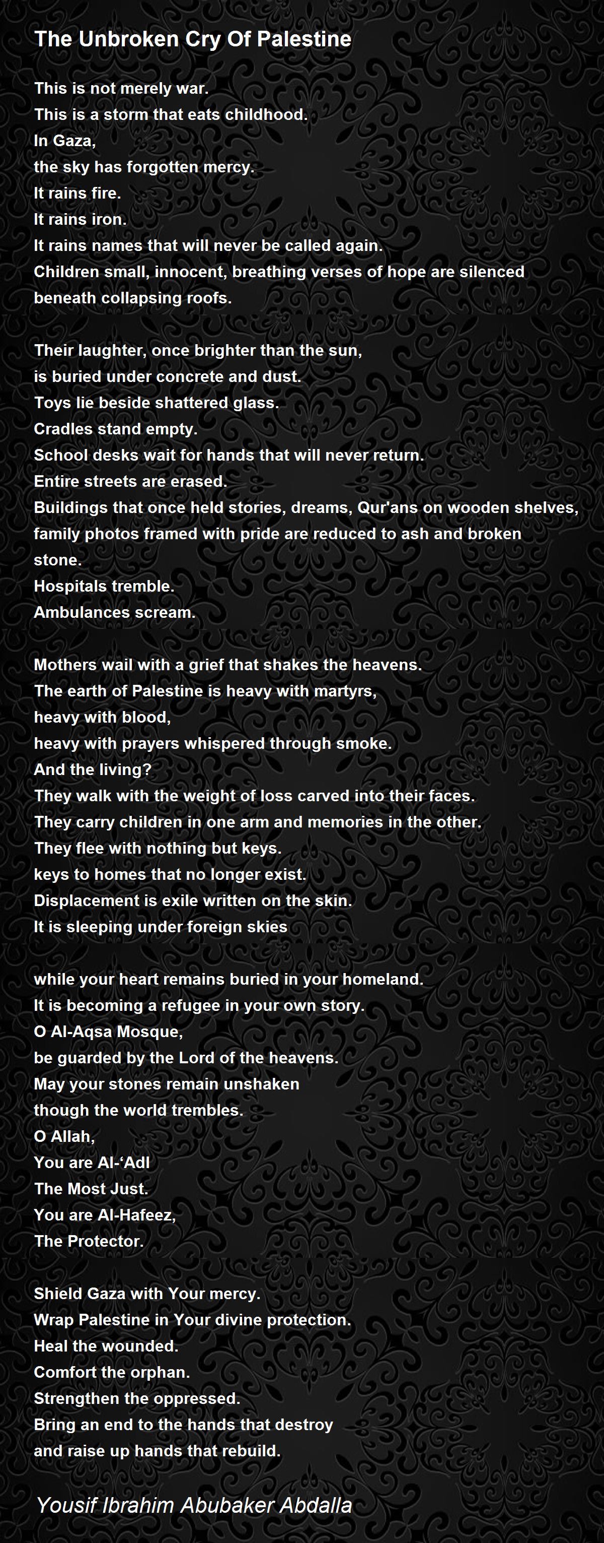 And let Palestine stand scarred, grieving, unbroken until dawn finally breaks