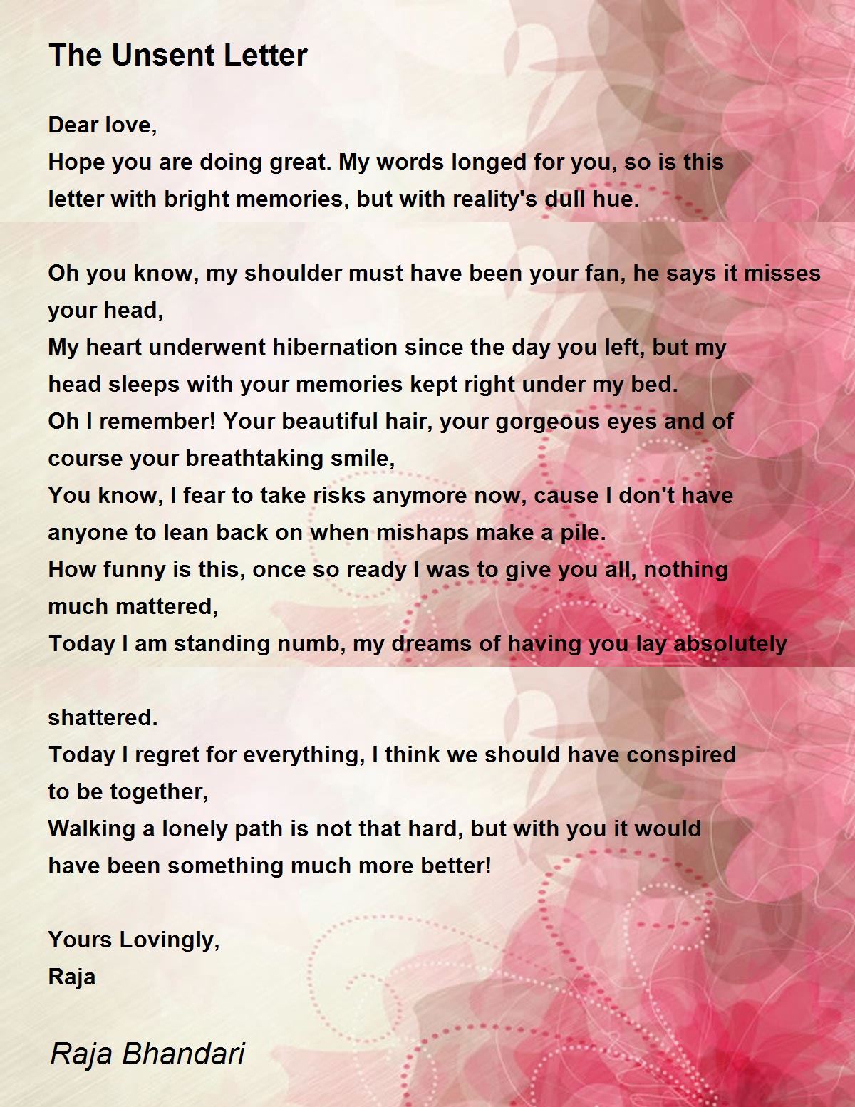 Hope you are doing great.My words longed for you, so is this letter with bright memories, but with reality's dull hue.