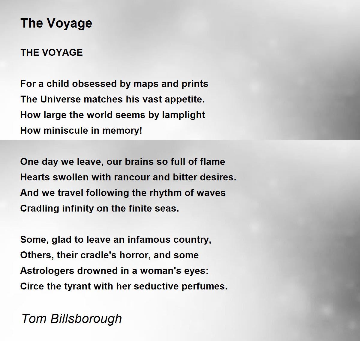 I love this poem, but it is so despairing. The only trace of happiness lies in those childhood memories of his dream of The Voyage. But when he is old enough to actually book passage, he is jaded, possessed by ennui, unable to see the voyage for what it is: an escape from his self-imposed prison. As a young man, Baudelaire sailed to India: Great! the exoticism, the eroticism of India would be an ideal setting for for his lush, sensuous poetry, and he could live the poetry through his senses and being. NO! On the Sychelles Islands, just shy of India, he transferred to a ship RETURNING TO FRANCE. WHY? ? Because reality could never fulfill the Dream and its blunt materiality would crush the fragile spirit of the Dream. So he returned to Paris and the hashish den and dreamed of an India of the Imagination - boundless, perfect, never-ending. (For a sturdy, pioneering vision of The Journey, read Whitman's VOYAGE TO INDIA, and it you've read, let's both re-read it and celebrate the essential health espoused by the American poet compared the sickness of the European poet (Hold him in your armchair, you can feel his disease.) Throughout I feel Whitman summons us to complete the abortive voyage of Columbus, or put it this way, One thing I can tell you is you've got to be free.)