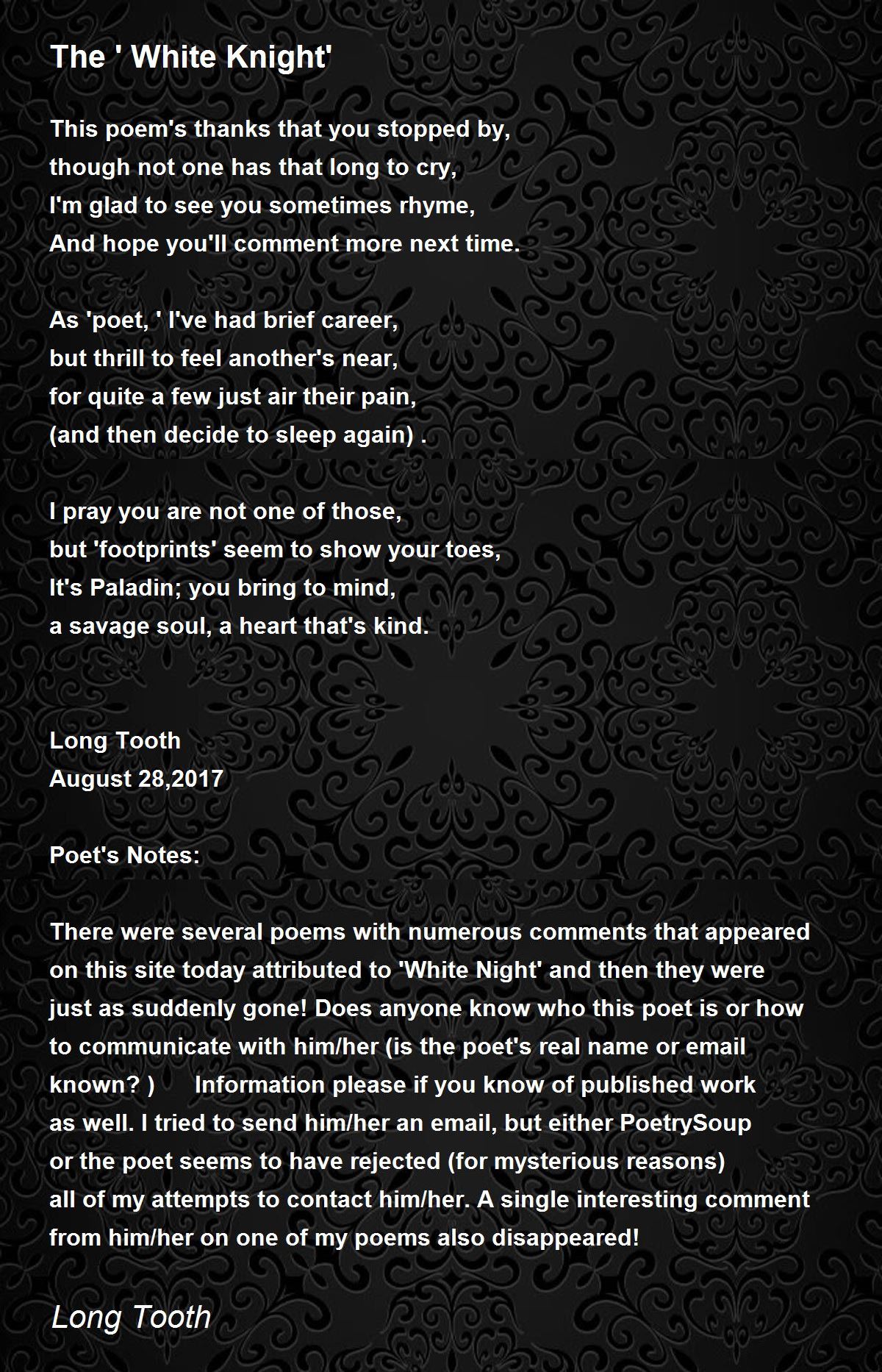 There were several poems with numerous comments that appeared on this site today attributed to 'White Night' and then they were just as suddenly gone! Does anyone know who this poet is or how to communicate with him/her (is the poet's real name or email known?) Information please if you know of published work as well. I tried to send him/her an email, but either PoetrySoup or the poet seems to have rejected (for mysterious reasons) all of my attempts to contact him/her. A single interesting comment from him/her on one of my poems also disappeared!