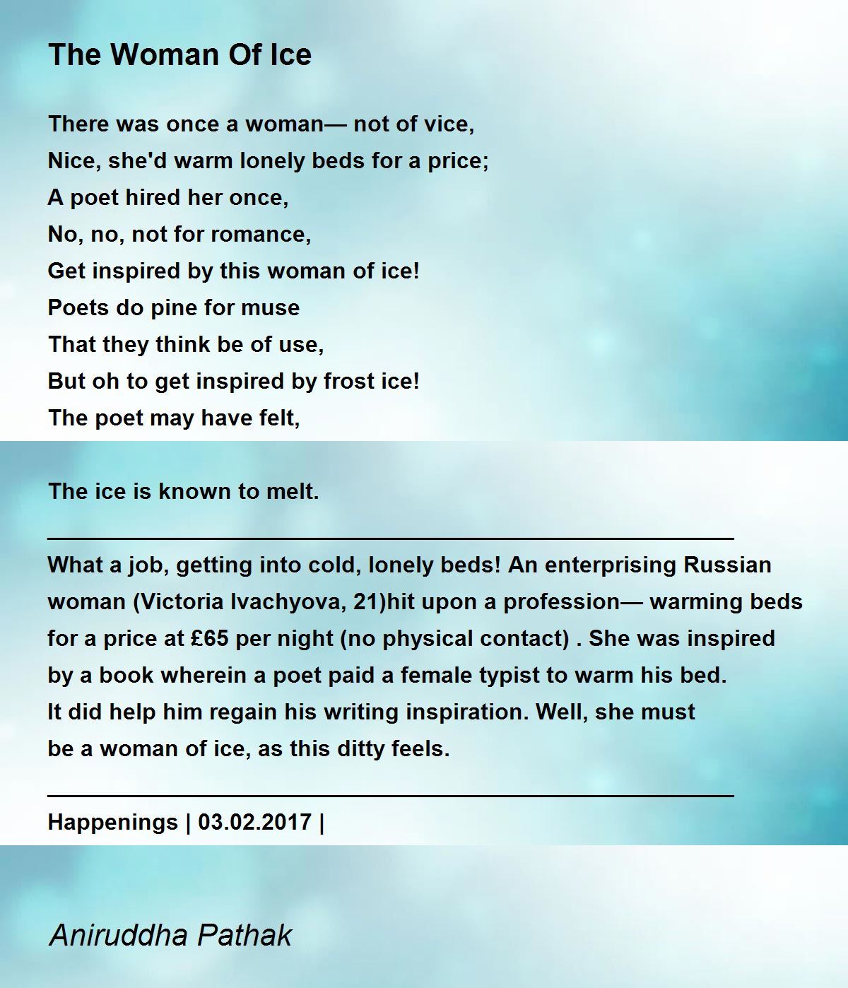 What a job, getting into cold, lonely beds! An enterprising Russian woman (Victoria Ivachyova,21)hit upon a profession— warming beds for a price at £65 per night (no physical contact) . She was inspired by a book wherein a poet paid a female typist to warm his bed. It did help him regain his writing inspiration. Well, she must be a woman of ice, as this ditty feels.