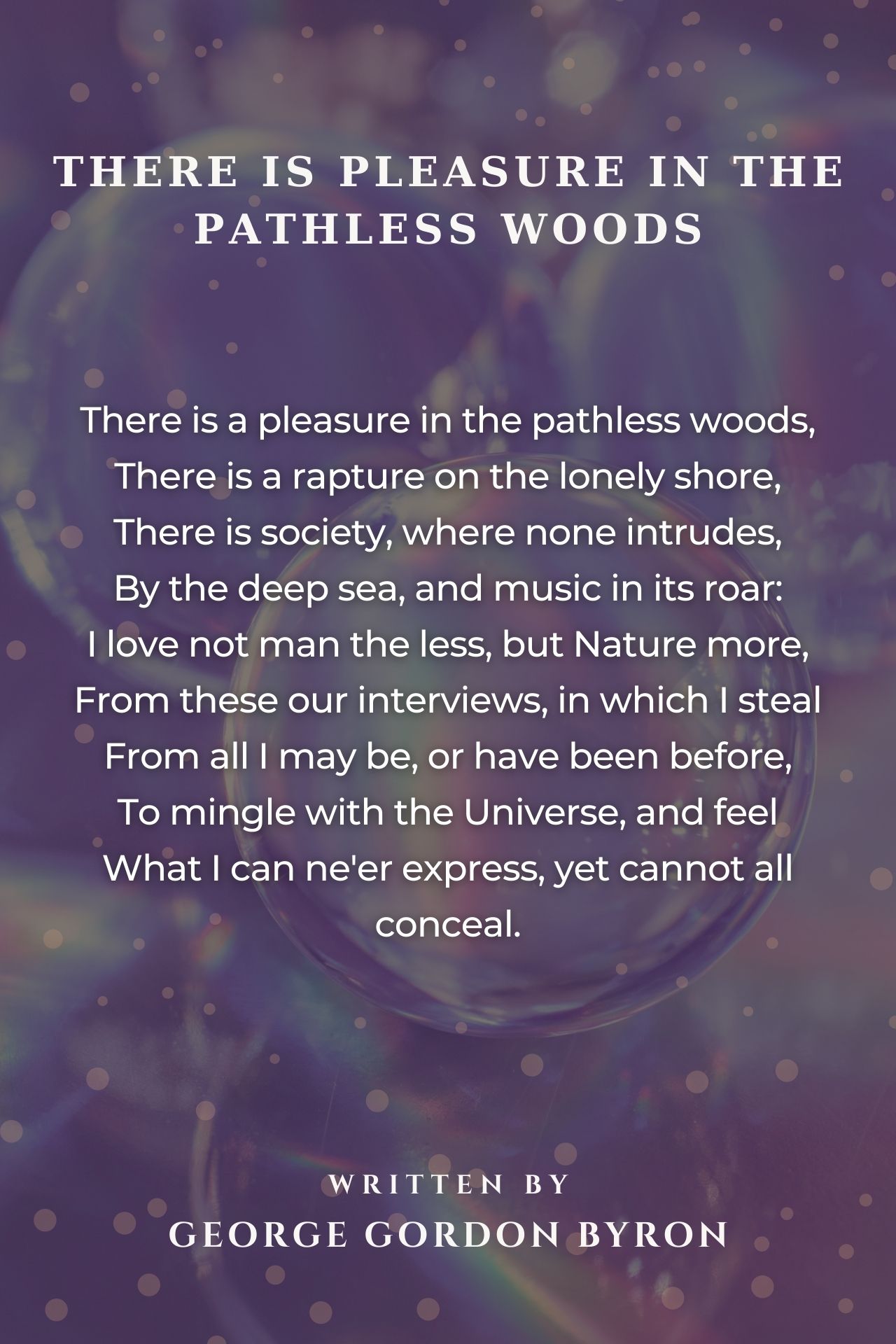 There is a pleasure in the pathless woods, There is a rapture on the lonely shore, There is society where none intrudes, By the deep Sea, and music in its roar: I love not Man the less, but Nature more, From these our interviews, in which I steal From all I may be, or have been before, To mingle with the Universe, and feel What I can ne'er express, yet cannot all conceal. Roll on, thou deep and dark blue Ocean-roll! Ten thousand fleets sweep over thee in vain; Man marks the earth with ruin-his control Stops with the shore; -upon the watery plain The wrecks are all thy deed, nor doth remain A shadow of man's ravage, save his own, When for a moment, like a dropp of rain, He sinks into thy depths with bubbling groan, Without a grave, unknelled, uncoffined, and unknown. His steps are not upon thy paths, -thy fields Are not a spoil for him, -thou dost arise And shake him from thee; the vile strength he wields For earth's destruction thou dost all despise, Spurning him from thy bosom to the skies, And send'st him, shivering in thy playful spray And howling, to his gods, where haply lies His petty hope in some near port or bay, And dashest him again to earth: —there let him lay. ~by Lord George Gordon Byron, from Childe Harold's Pilgrimage