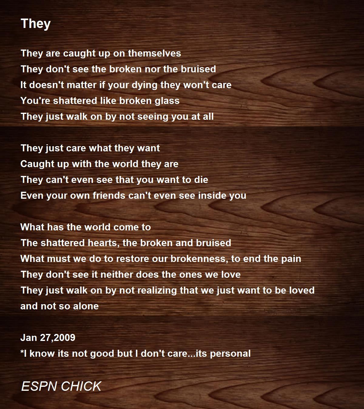 They just walk on by not realizing that we just want to be loved and not so alone