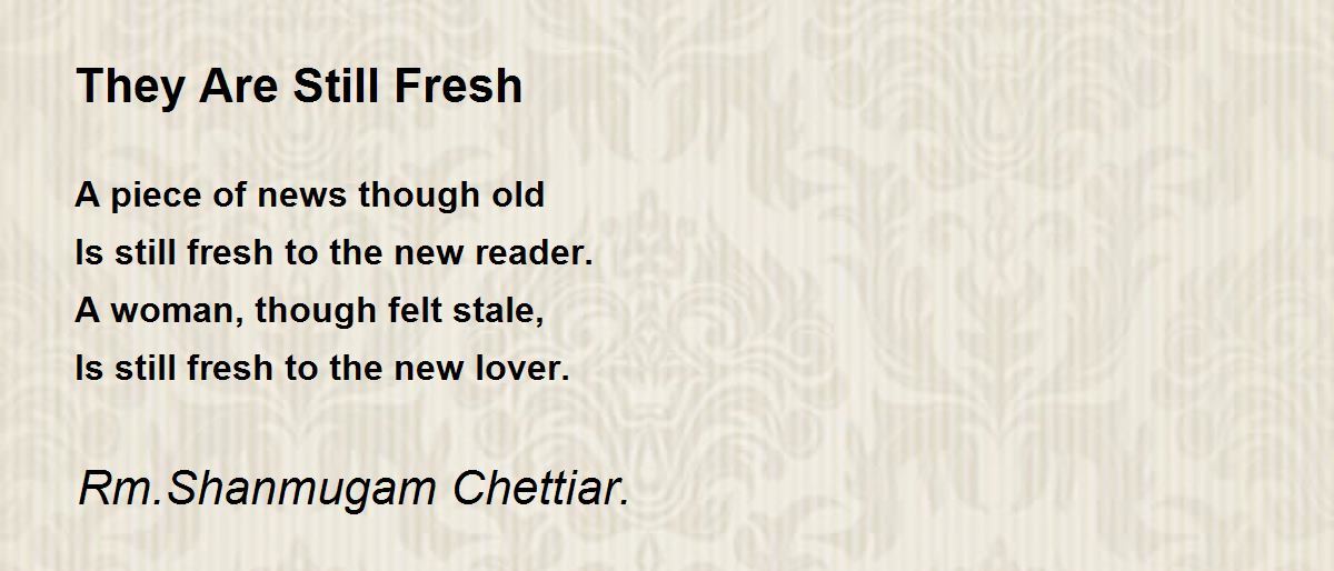 A piece of news though old Is still fresh to the new reader. A woman, though felt stale, Is still fresh to the new lover.