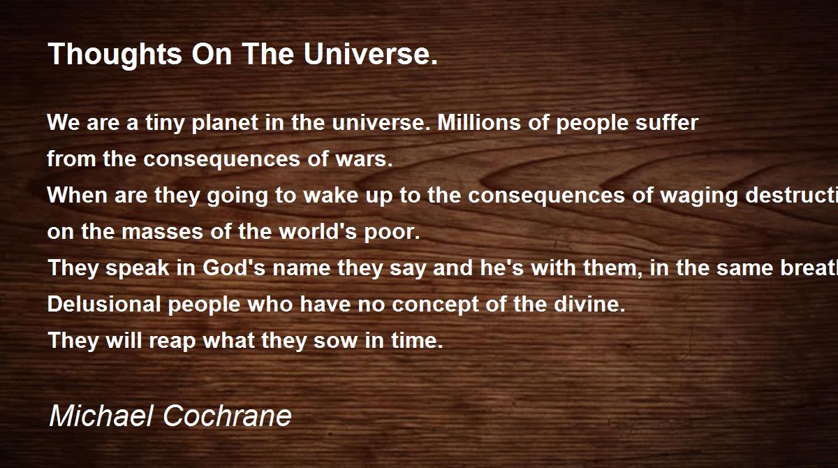 We are a tiny planet in the universe. Millions of people suffer from the consequences of wars.
