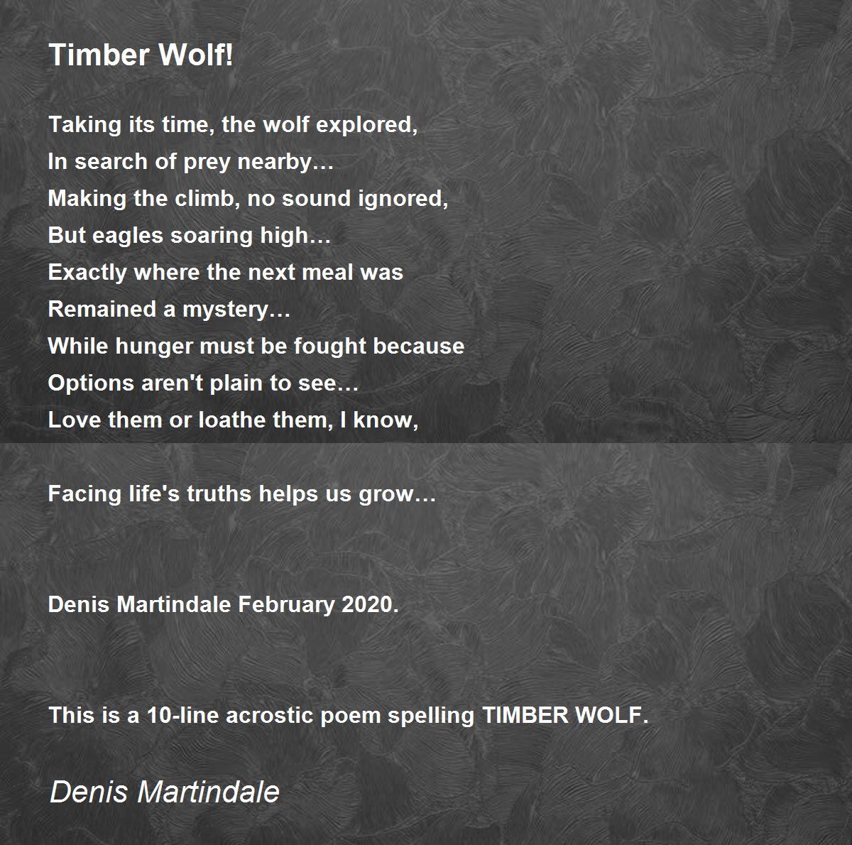 This is a 10-line acrostic poem spelling TIMBER WOLF.