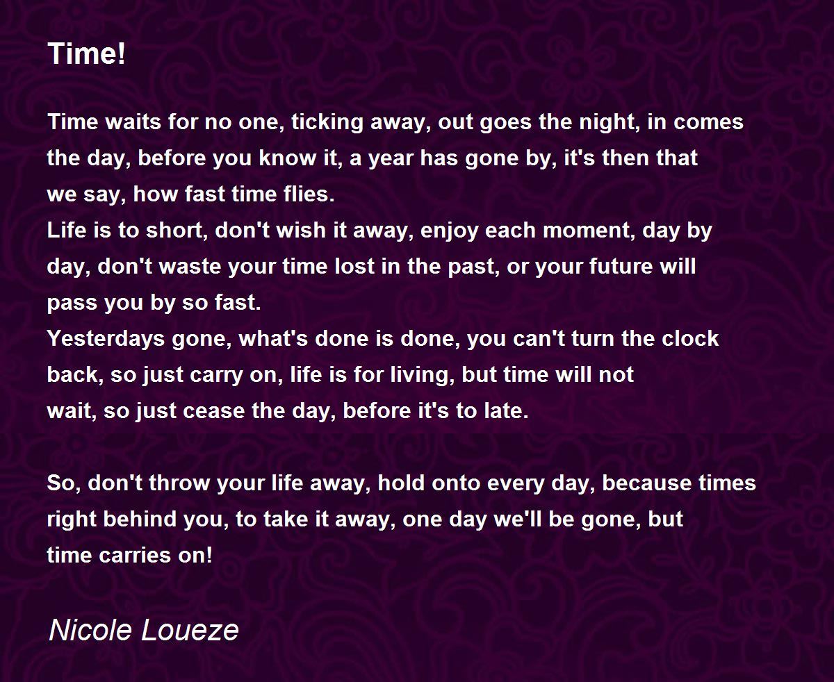 Time waits for no one, ticking away, out goes the night, in comes the day, before you know it, a year has gone by, it's then that we say, how fast time flies.
