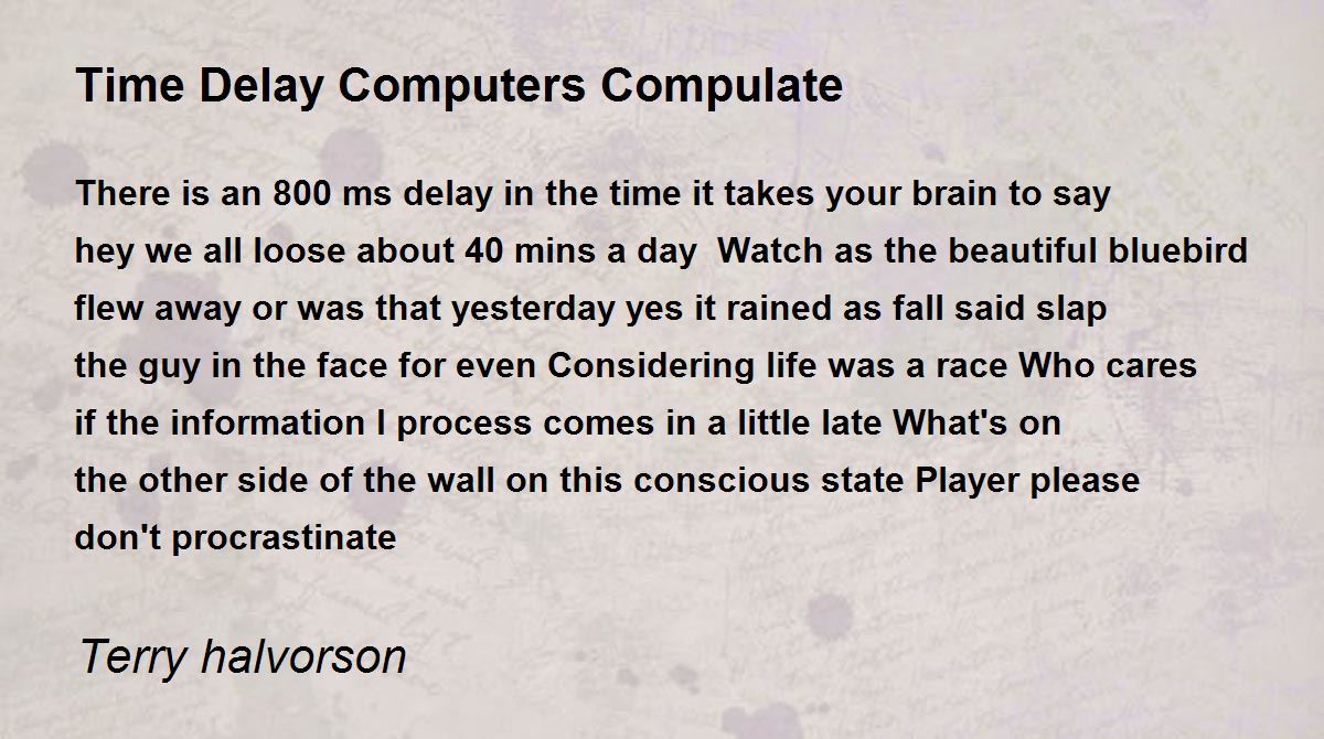There is an 800 ms delay in the time it takes your brain to say hey we all loose about 40 mins a day Watch as the beautiful bluebird flew away or was that yesterday yes it rained as fall said slap the guy in the face for even Considering life was a race Who cares if the information I process comes in a little late What's on the other side of the wall on this conscious state Player please don't procrastinate