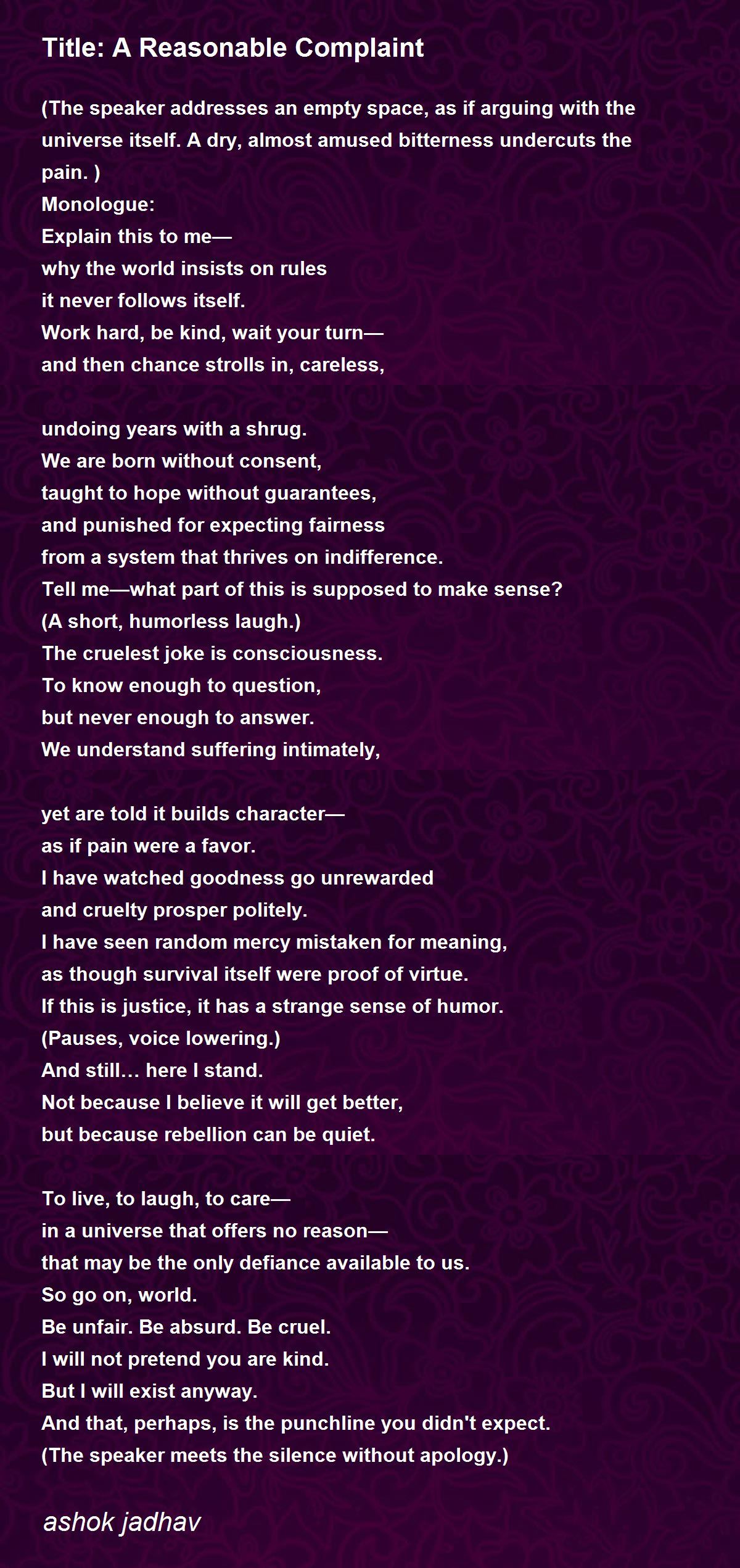 (The speaker addresses an empty space, as if arguing with the universe itself. A dry, almost amused bitterness undercuts the pain.)
