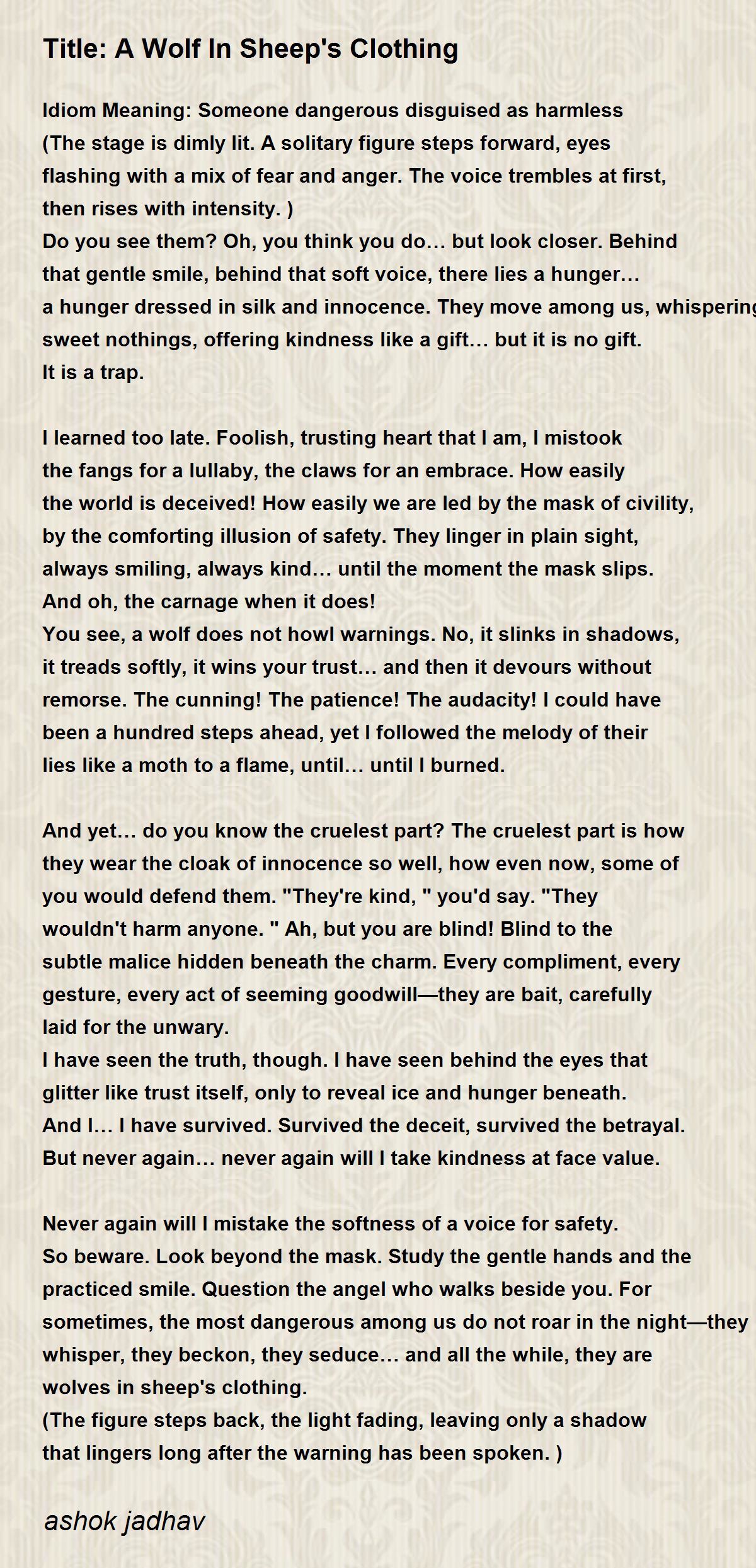 So beware. Look beyond the mask. Study the gentle hands and the practiced smile. Question the angel who walks beside you. For sometimes, the most dangerous among us do not roar in the night—they whisper, they beckon, they seduce… and all the while, they are wolves in sheep's clothing.