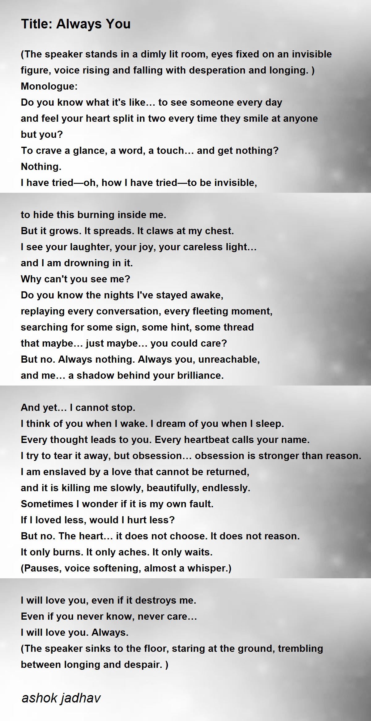 (The speaker stands in a dimly lit room, eyes fixed on an invisible figure, voice rising and falling with desperation and longing.)