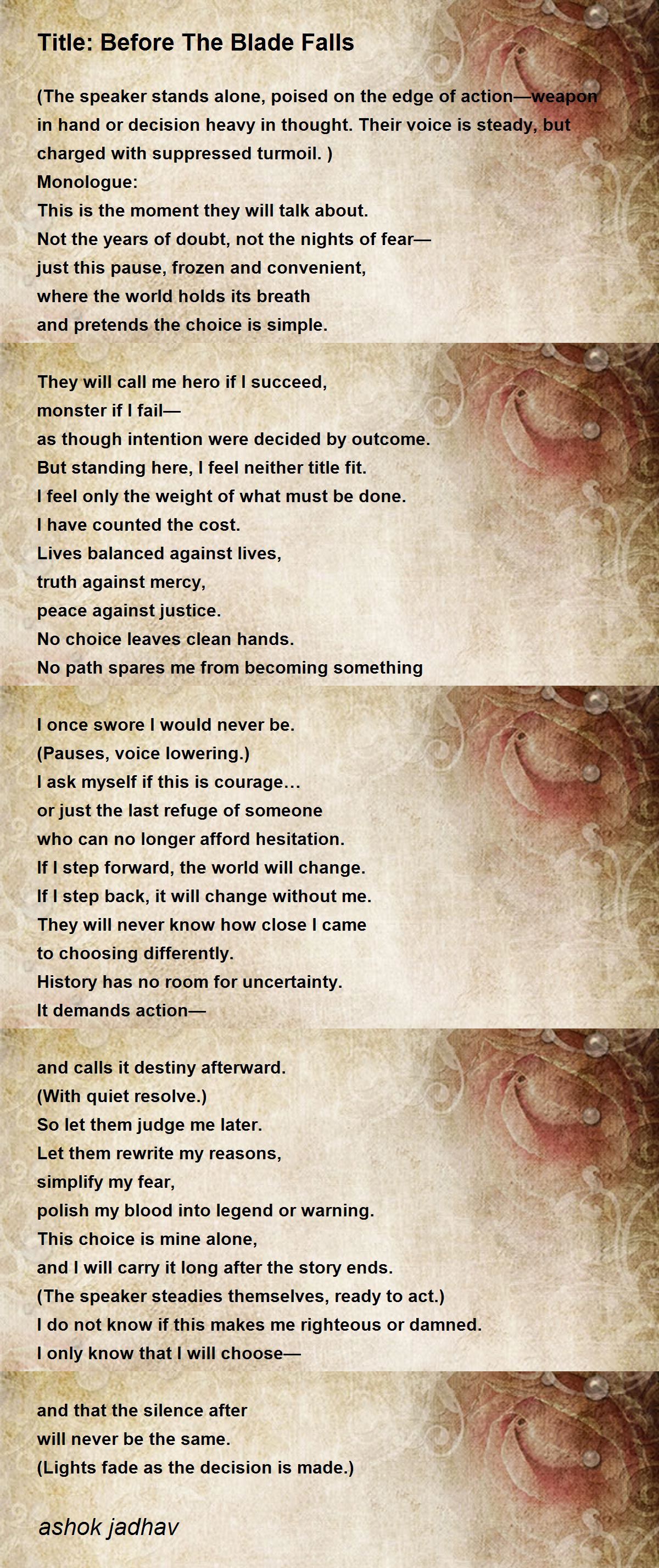 (The speaker stands alone, poised on the edge of action—weapon in hand or decision heavy in thought. Their voice is steady, but charged with suppressed turmoil.)