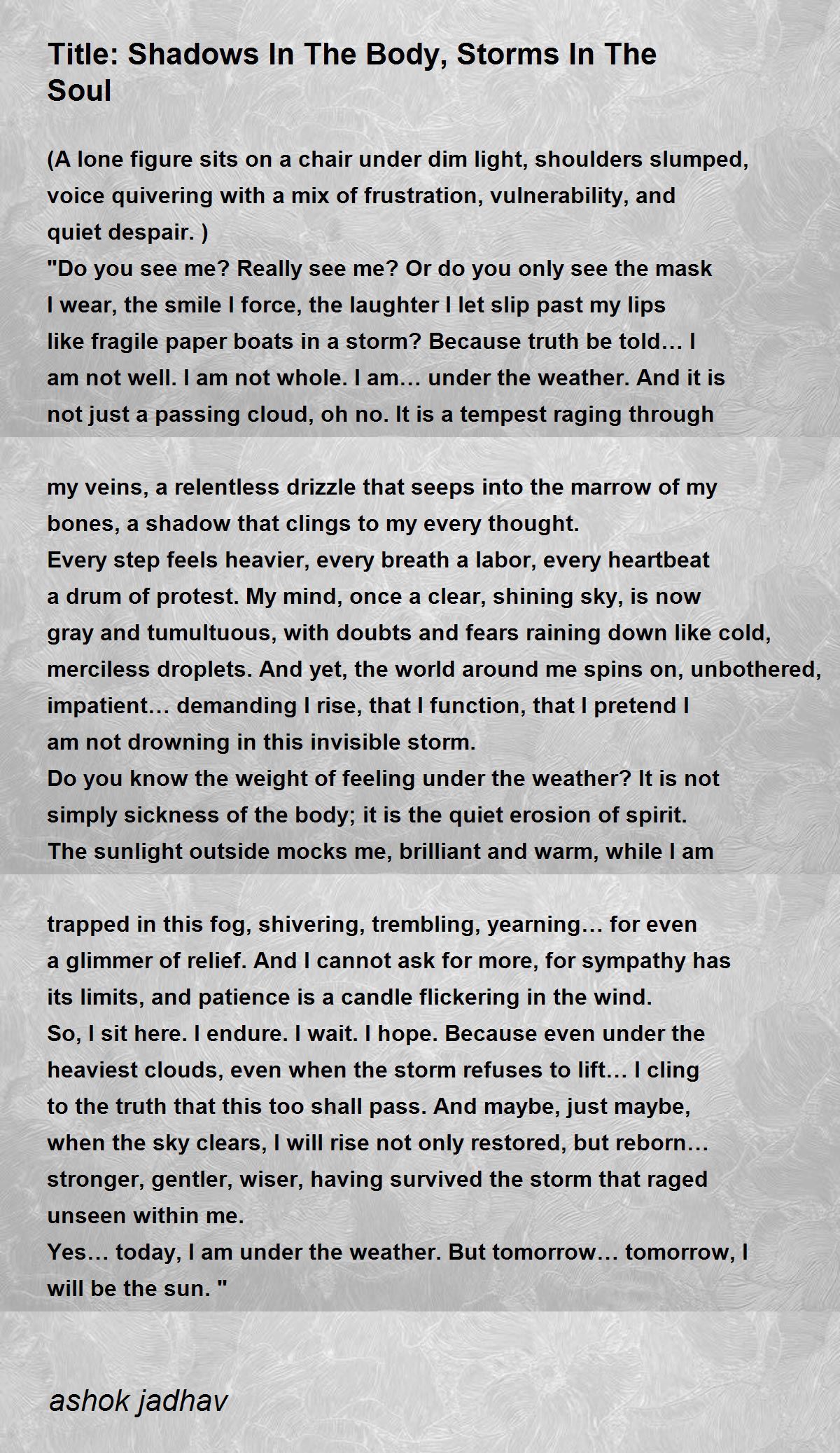 "Do you see me? Really see me? Or do you only see the mask I wear, the smile I force, the laughter I let slip past my lips like fragile paper boats in a storm? Because truth be told… I am not well. I am not whole. I am… under the weather. And it is not just a passing cloud, oh no. It is a tempest raging through my veins, a relentless drizzle that seeps into the marrow of my bones, a shadow that clings to my every thought.