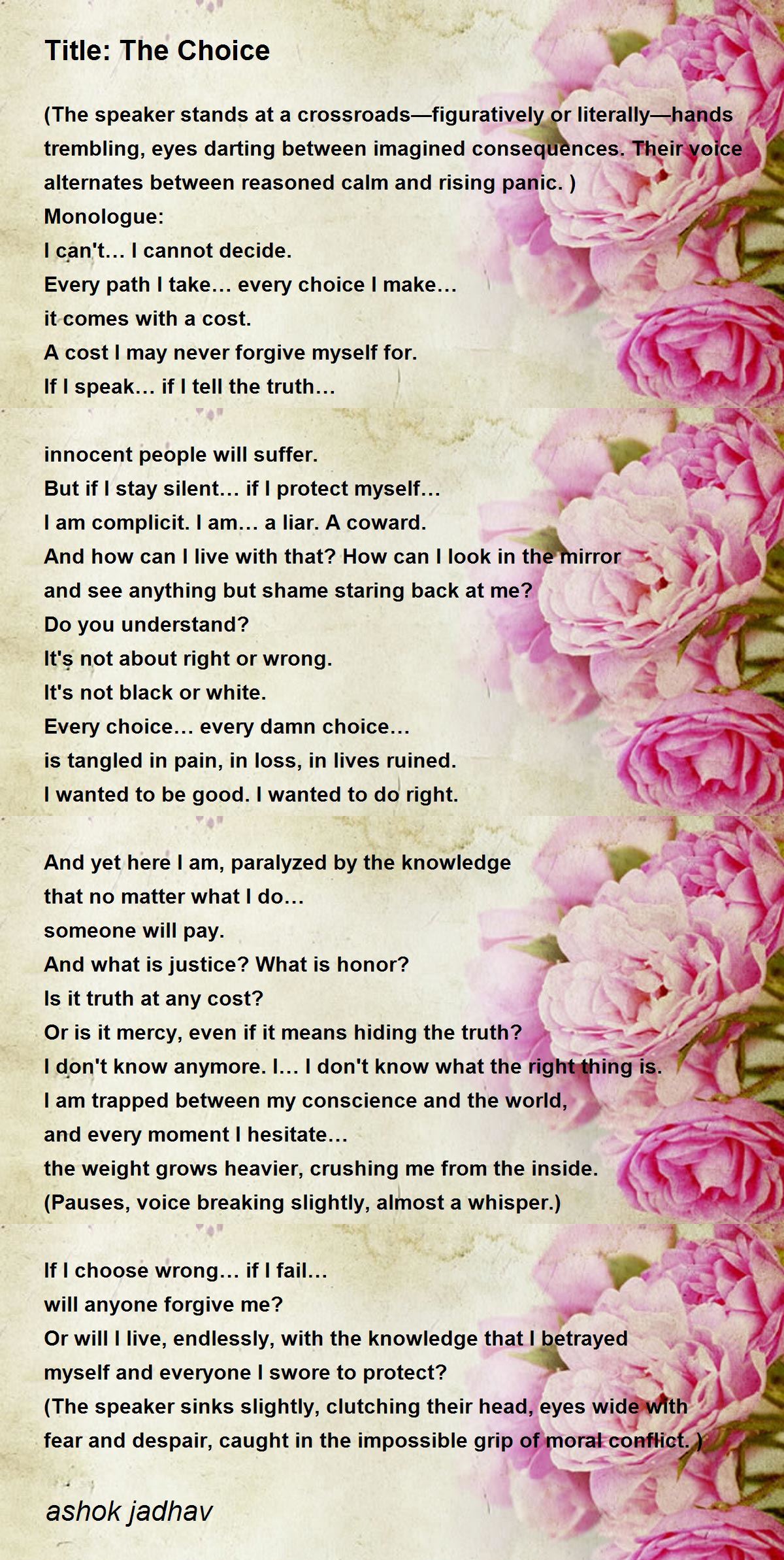 (The speaker stands at a crossroads—figuratively or literally—hands trembling, eyes darting between imagined consequences. Their voice alternates between reasoned calm and rising panic.)